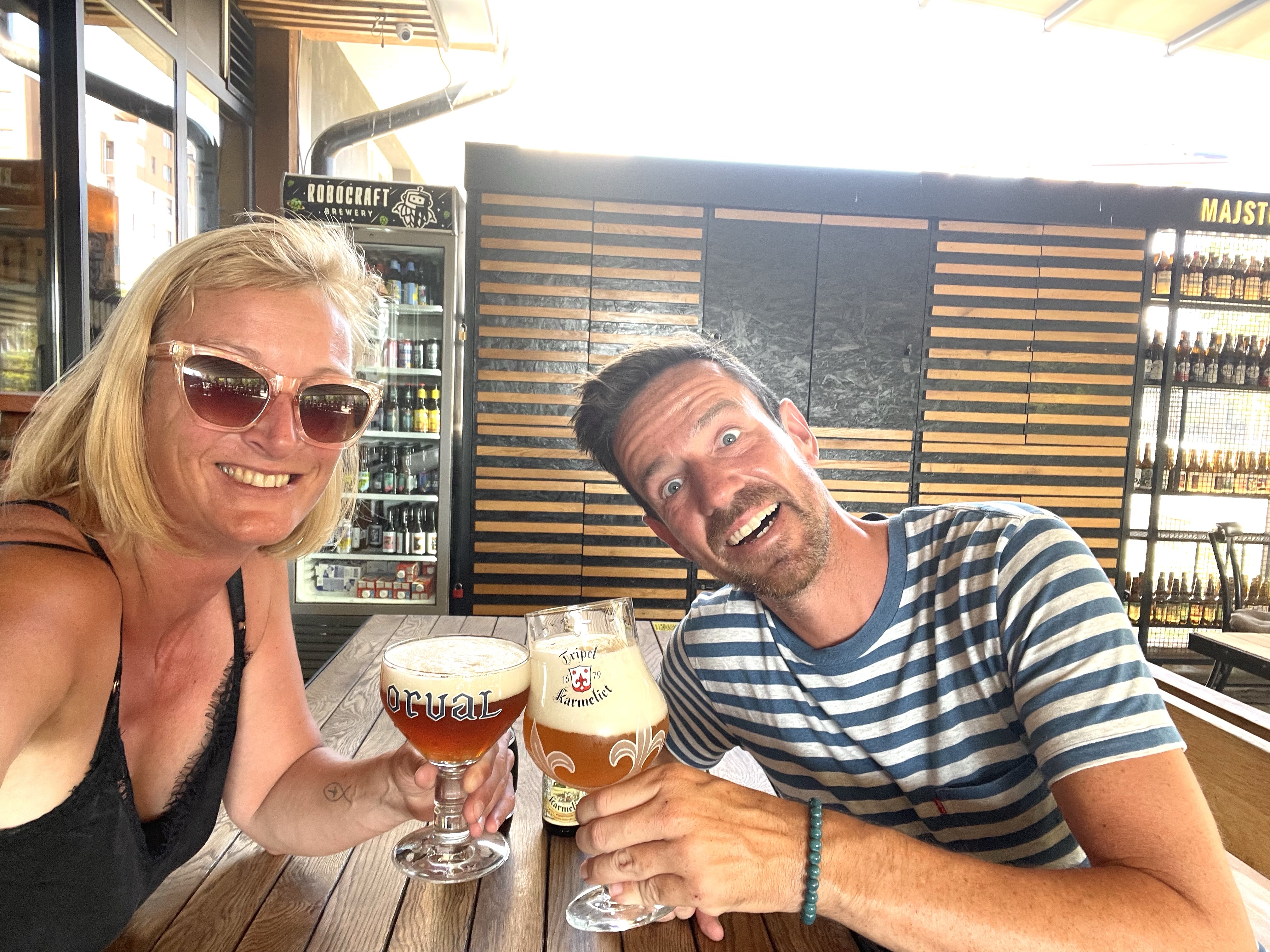 Als afsluiter van de dag had ik een kleine verrassing. Steven had al een paar keer aangegeven dat een lekker Belgisch biertje wel zou smaken. Niet dat de lokale pintjes zo slecht zijn maar onze bieren zijn toch van een ander kaliber. In een buitenwijk vinden we Majstor Za Pivo, een toffe plek met bieren uit verschillende landen. Een nog grotere lach op onze smoel wanneer we zien dat zowel Karmeliet als Orval op de kaart staan. 😁
