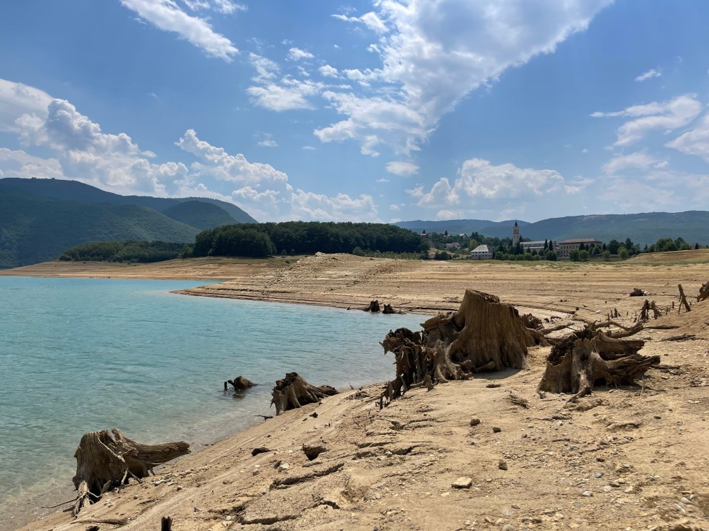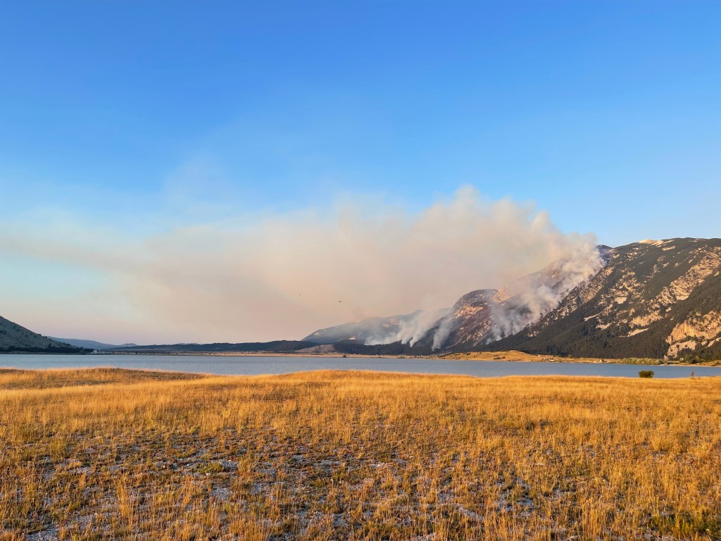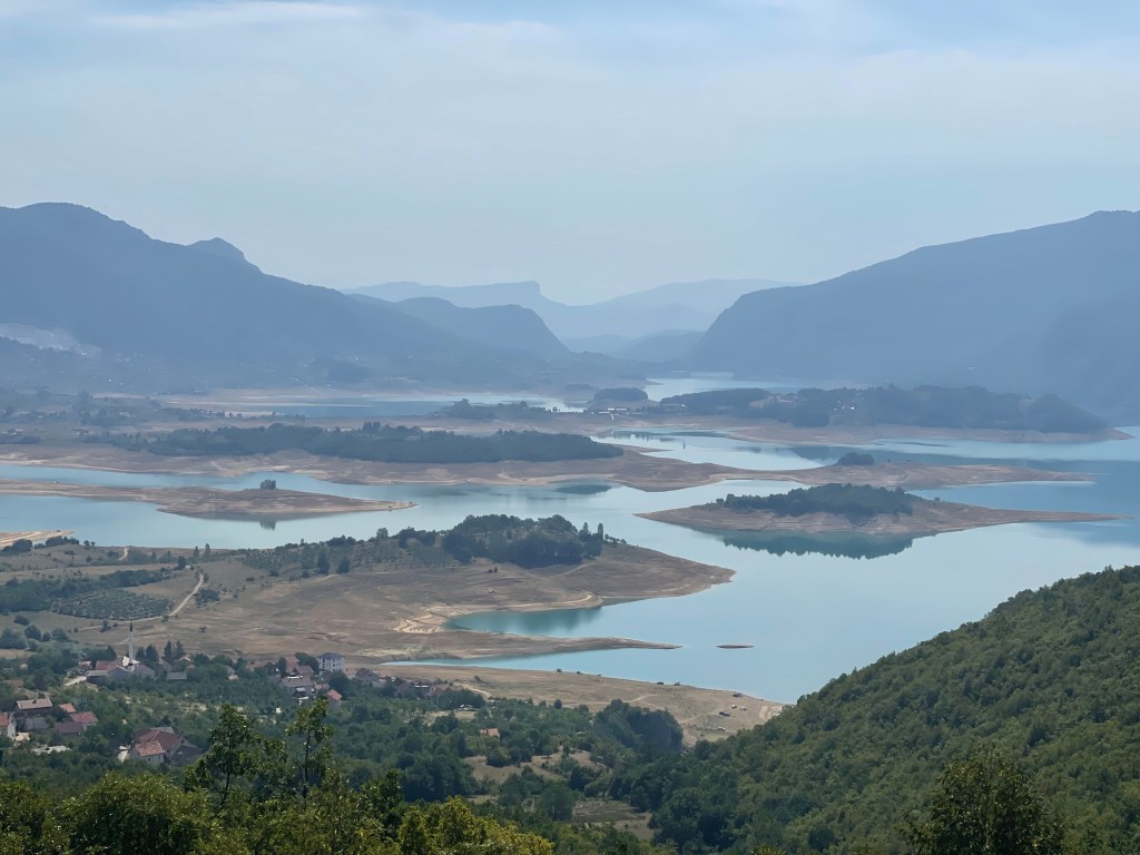 Op naar Blidinje Natuurpark. We rijden van Konjic de weg langs de Neretva rivier die overloopt in het Jablanicko meer. Mooie plekken maar we willen koelere temperaturen dus stijgen. We naderen het meer van Blidinje en zien in de verte rook die opstijgt uit de bossen op de bergflank. Dichterbij zetten we ons even aan kant om te kijken wat er precies gaande is. We zien net een klein blusvliegtuig zijn lading lossen.