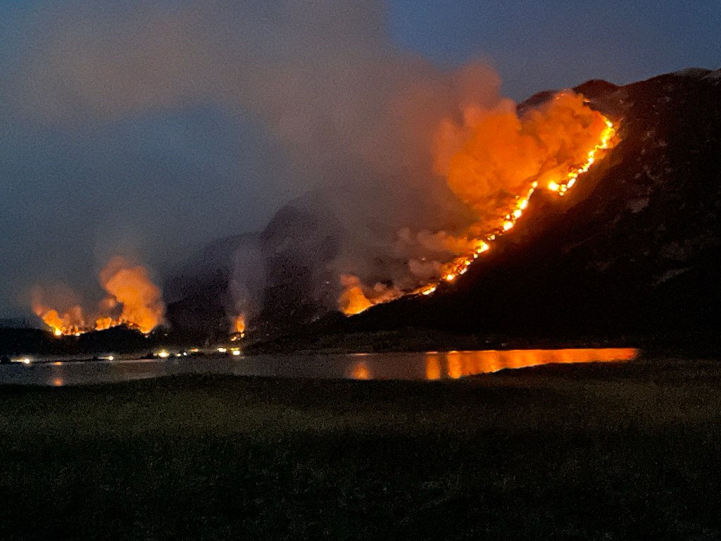We rijden verder naar het kamp dat we in gedachten hadden. Even twijfel, het ligt aan de voet van de brandende berg. Hoe snel gaat zo’n vuur eigenlijk? De omgeving is kurkdroog en er staat best wel een windje. Aangekomen zien we dat het kamp op een grasvlakte ligt, weinig gevaar besluiten we. Het huis van de kampeigenaar daarentegen ligt iets hogerop in het bos. De vriendelijke man is er niet gerust in. Wij zouden het ook niet zijn. Al 8 dagen wordt het bos stukje voor stukje weggevreten door de vlammen. En de middelen ontbreken om hier snel een einde aan te maken. Het blusvliegtuigje vliegt nog enkele keren over maar bij het vallen van de nacht stopt ook deze. Dan pas zien we de grootte van het inferno. Triest hoe al deze natuurpracht in vlammen opgaat.