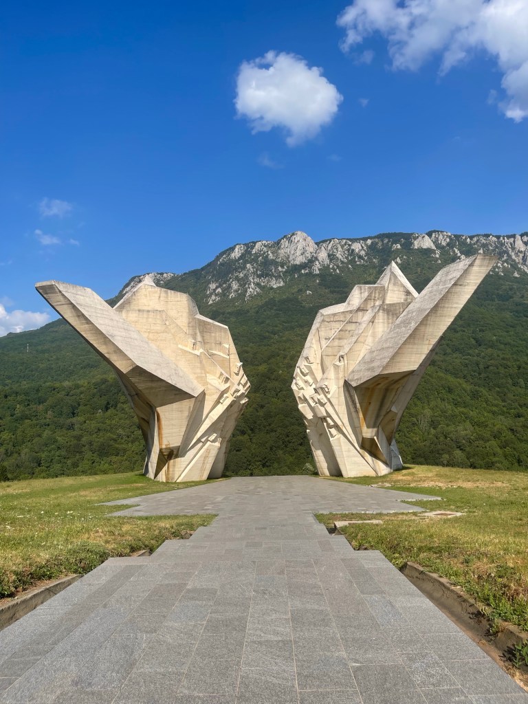 We stoppen onderweg nog even bij de Vallei van de Helden in Tjentište. Dit monument herdenkt de Slag van Sutjeska. De slag duurde van 15 mei tot 16 juni 1943 en had tot doel het Partizanenleger van Josib Broz Tito te vernietigen.