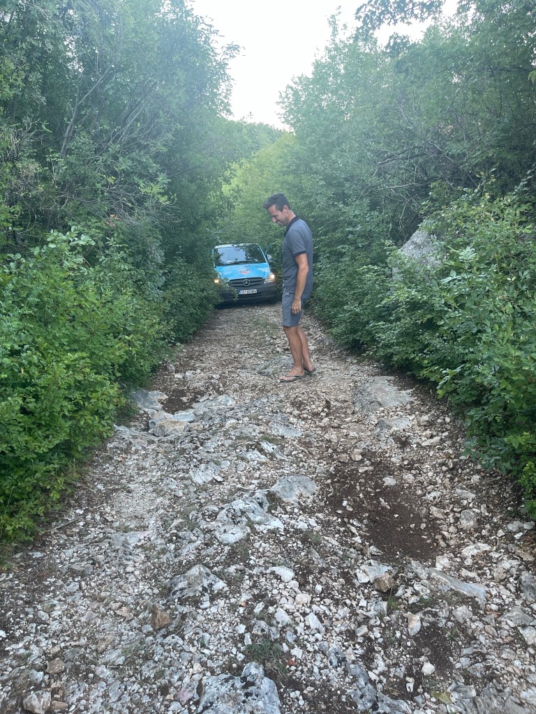 Het zal wel aan die twee cocktails liggen maar deze weg lijkt mij minder erg dan de terugweg van Lukomir. Misschien moet ik dit wel onthouden voor de volgende off-road. 🤓 En daar staan ze plots, Leonie en Mikesh. Een opgeluchte blik in zijn ogen want hij ziet zelf geen mogelijkheid om verder te geraken. We verzamelen wat stenen om de grootste putten te delven en na 3 pogingen zijn ze erdoor.