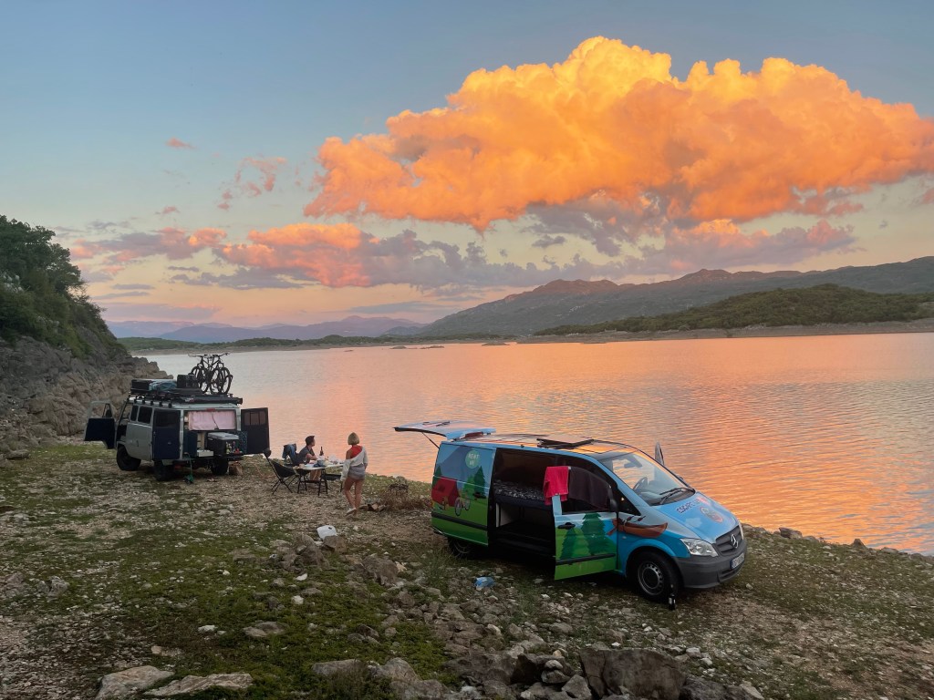 Naast Durmitor zijn er nog 4 Nationale Parken in Montenegro. Mooi verspreid over het land, tegenwijzerzin lijkt ons de meest efficiënte volgorde. Eerste op de lijst is daarmee Lovcen, aan de kust. Die richting uit dus. Op onze weg ligt Nikšić, de tweede grootste stad van Montenegro en bezitter van 2 mooie meren. Het drukke Krupac Meer en het rustige Slano Meer. We installeren ons op een gezellig terrasje in de binnenstad om op Park4Night een geschikte plek te vinden. We kiezen er eentje aan het Slano Meer.