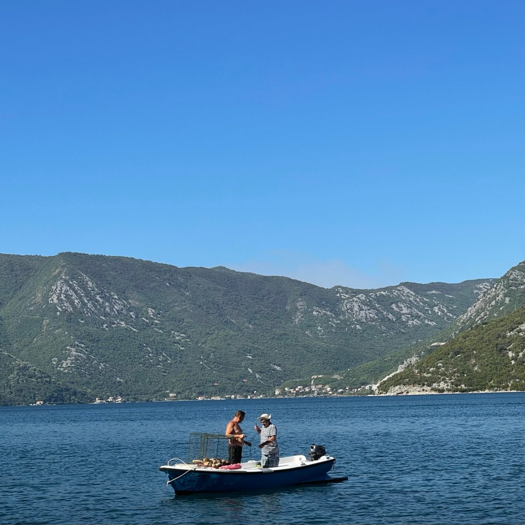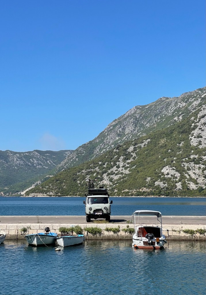 Op naar de kust. Het doel is Perast, we stranden in Risan, 3km eerder. In Perast zijn de parkeerkosten €12 per uur. In Risan, eerste lijn in de baai… €0. 🤷🏼♀️