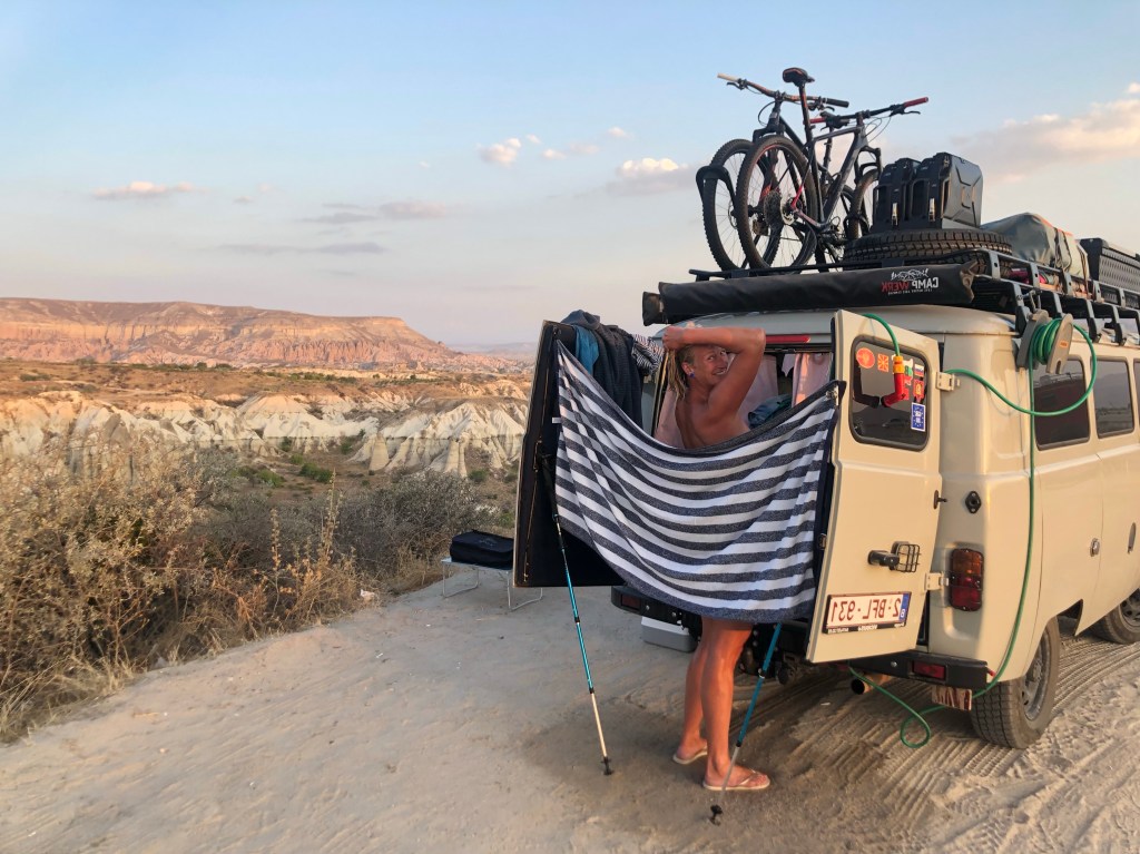Terug naar dezelfde plek om de avond en nacht door te brengen. Een douche met uitzicht! Normaal douchen we gewoon naast de Lowie maar nu waren er toch iets teveel pottenkijkers. 😎