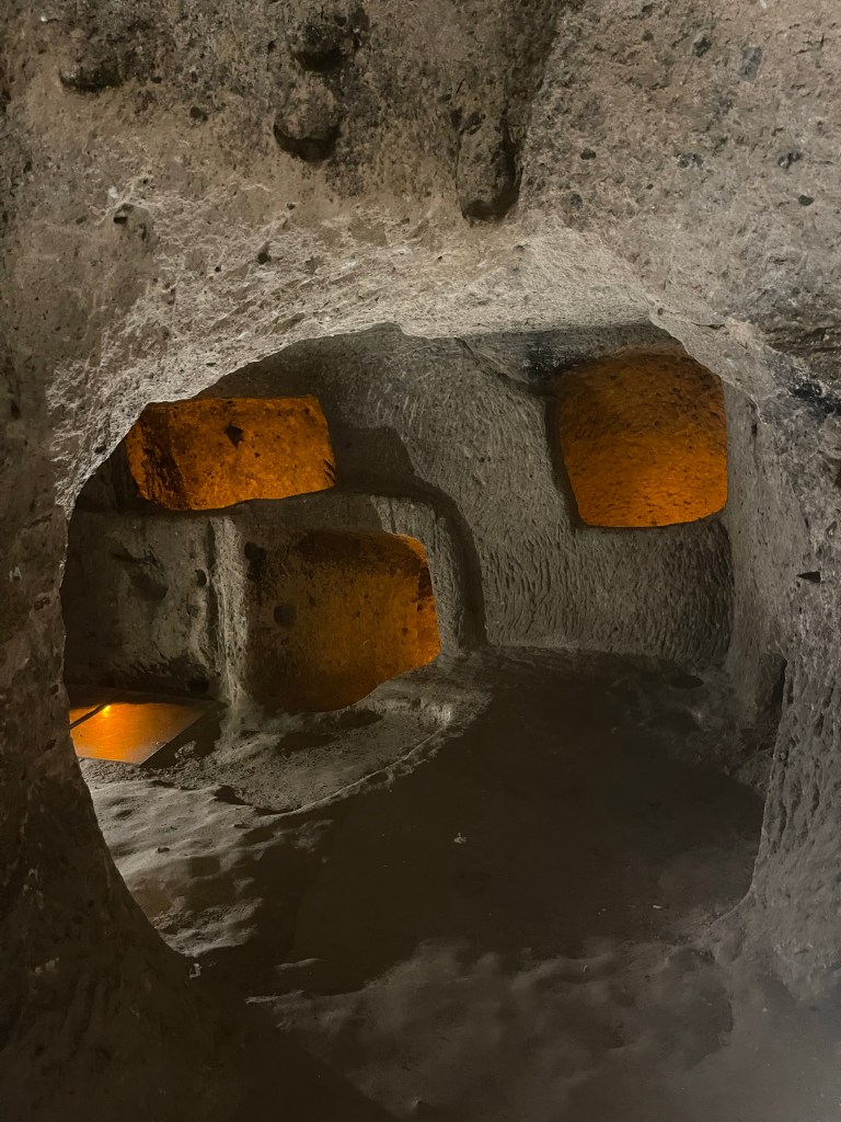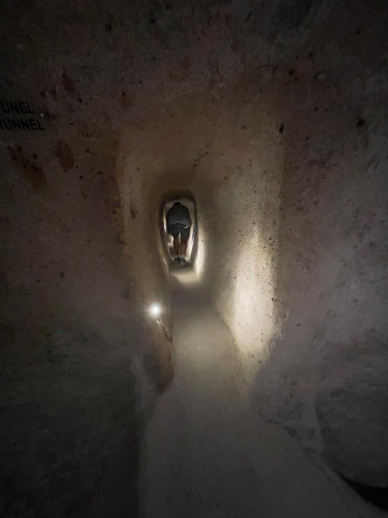 We ontbijten onder de ballonnen die lijken te blijven komen. Tegen 8u is het gewemel helemaal uitgestorven. We pakken in en rijden richting het zuiden. We bezoeken de ondergrondse stad in Kaymakli. Deze bestaat uit 8 verdiepingen, 4 daarvan zijn open voor het publiek. Wel de moeite. Claustrofobisch mag je hier niet zijn. De gangen zijn zeer smal bij momenten en vooral laag. En ok, wij zijn nu wel heel groot maar toch… 😬