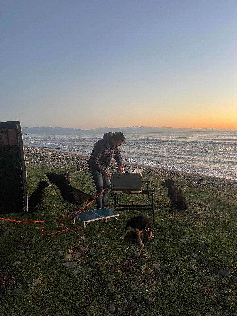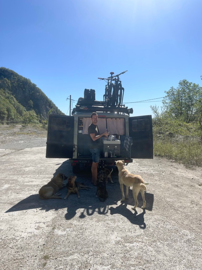 Onze eerste nacht in Georgië brengen we door op het strand in Grigoleti aan de Zwarte Zee. Het gehuchtje ligt iets verder dan de bekende kuststad Batumi. We arriveren net voor zonsondergang. In Turkije waren er al veel straathonden maar hier is het een veelvoud. We eten die avond met 7. 😅