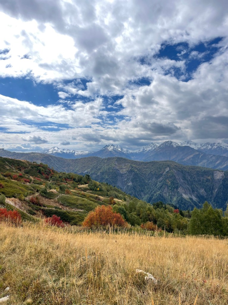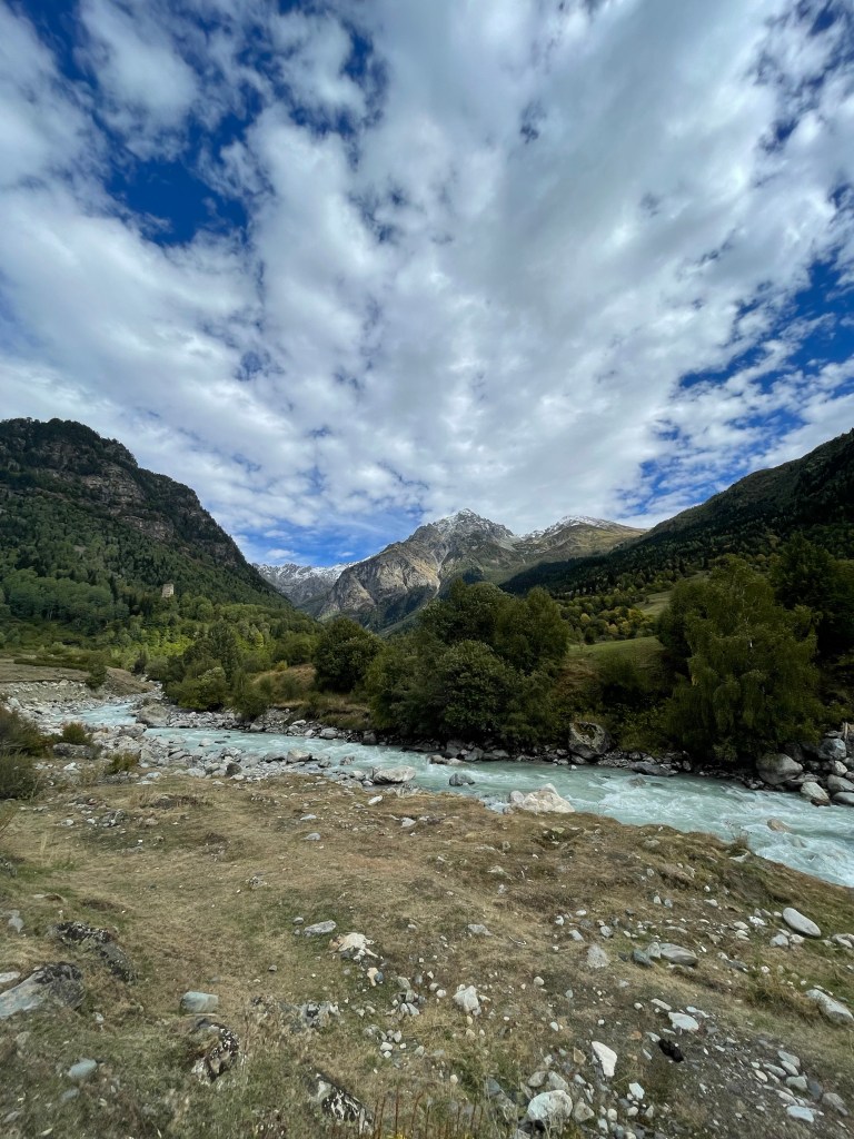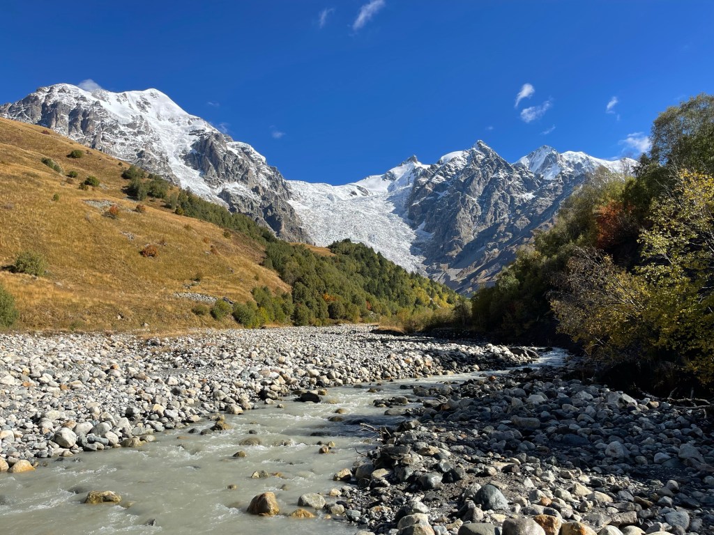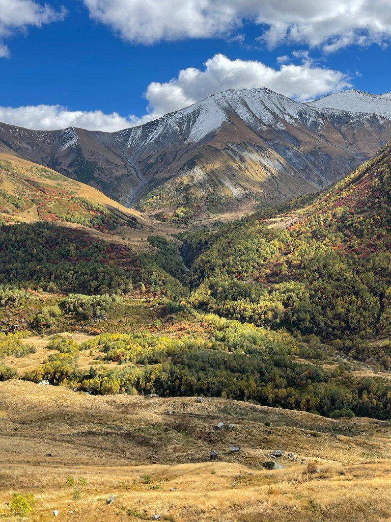 De 4 cakejes gaan mee als lunchpakket en we zetten aan richting Iprari, de derde bestemming. Opnieuw een prachtig zonnige dag, overweldigende landschappen, herfstkleuren, de Adishi-gletsjer…