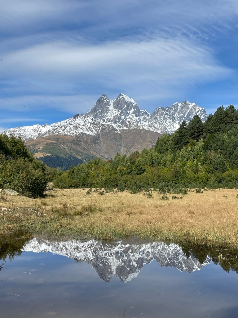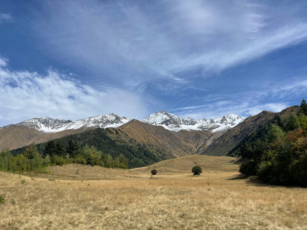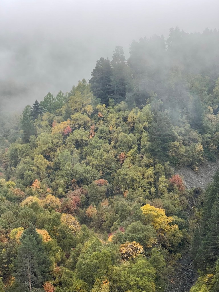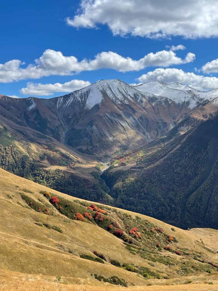 De 4 cakejes gaan mee als lunchpakket en we zetten aan richting Iprari, de derde bestemming. Opnieuw een prachtig zonnige dag, overweldigende landschappen, herfstkleuren, de Adishi-gletsjer…