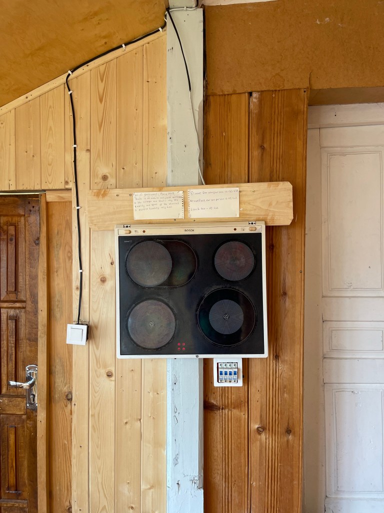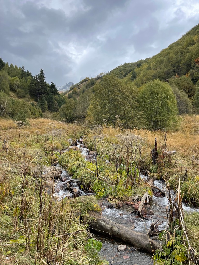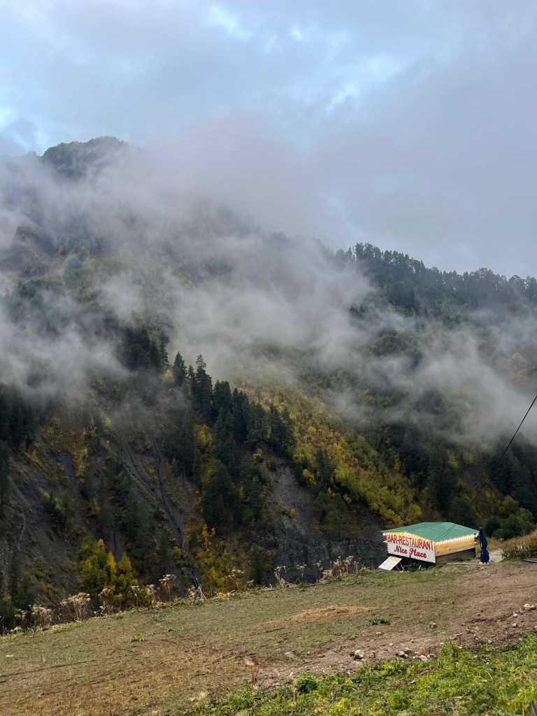De rest van de tocht verloopt vrij vlot. Het is bewolkt en vochtig. De tocht gaat meestal door bebost gebied. Niet onze favoriet. Eindelijk komen we terug in open gebied, we zien het dorp al in de verte en horen luide muziek weerklinken in het dal. Dichterbij zien we de oorsprong van dit geluid…’Nice Place’. Die eigenaar is zelfverzekerd. 🤓 We checken in bij Guesthouse Bashi, een ietwat verouderd gebouw maar een warme ontvangst. Het gezin dan toch, de ruimtes zijn koud en wat klam. Het toilet is bijna buiten. Enkele planken, met grote spleten, scheiden de pot en de buitenlucht. De enige verwarming is een oude kookplaat aan de muur. Een dikke 10 voor creativiteit!
