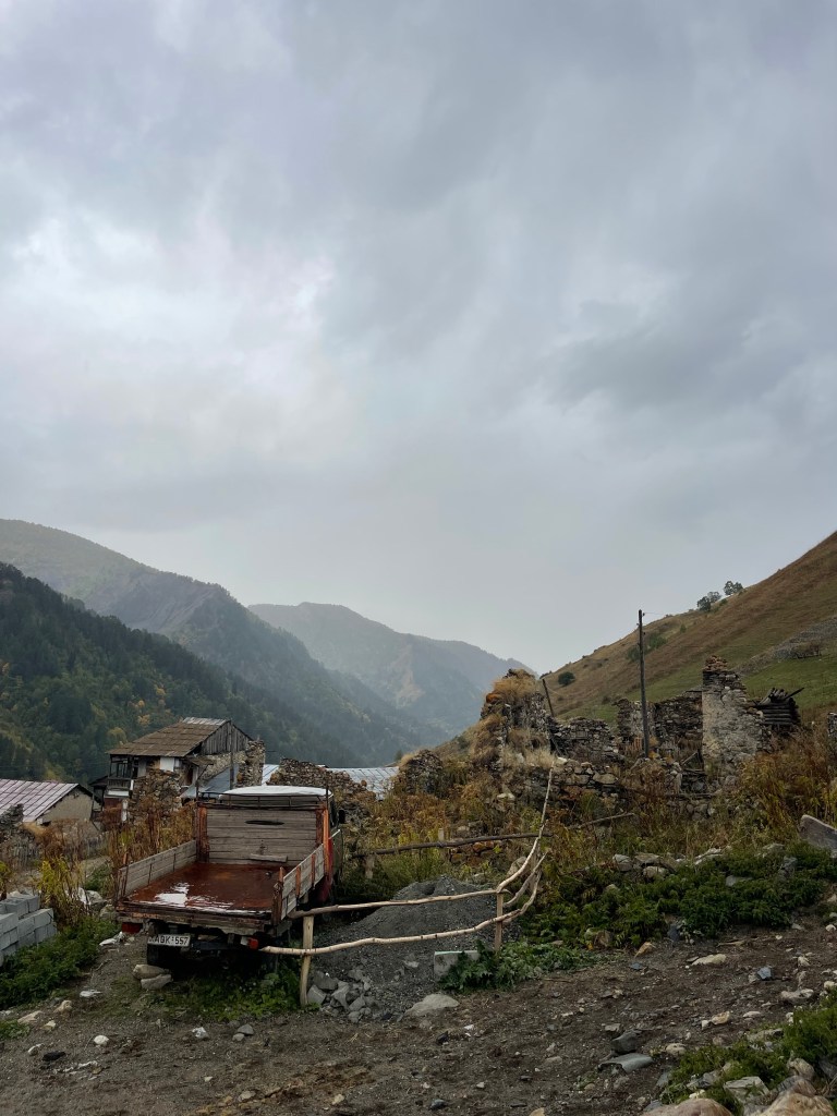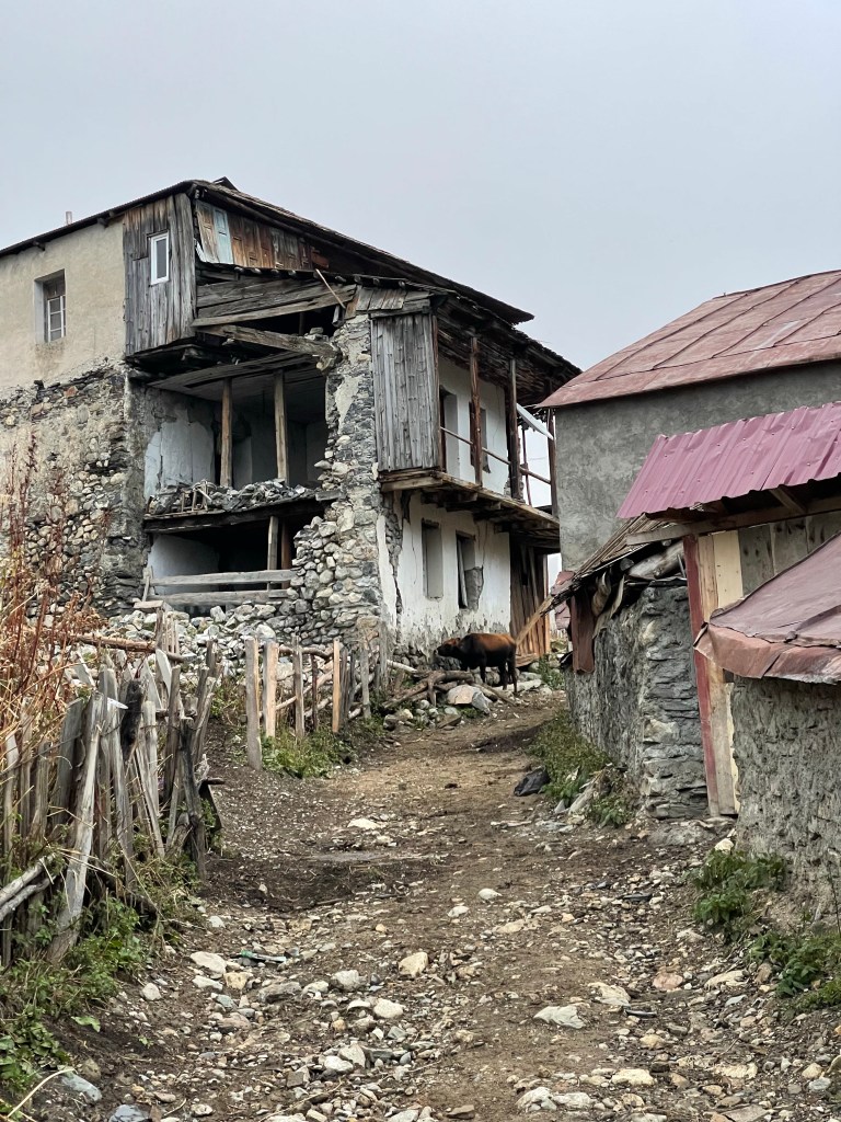 De dag erop zouden we een korte wandeling maken om de dagen erna de trekking van Mestia naar Ushguli aan te vatten. Ik heb echter een vreselijke nacht waarbij ik amper slaap en me werkelijk slecht voel. We slaan de wandeling over en de dag gaat voorbij met dutjes en slenteren in de stad. ‘s Avonds dineren we in Café Panorama waar de kloeke uitbaatster ons haar heerlijke specialiteiten voorschotelt. Kip Tkemali (een typische saus gemaakt van pruimen) en Tashmijabi (een smeuïge puree met kaas erdoor). Dessert!? Nee dank u! 😅
