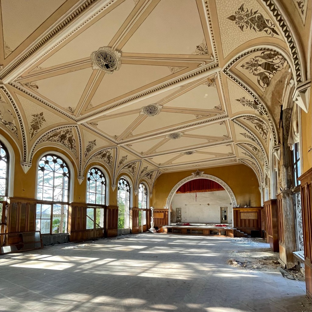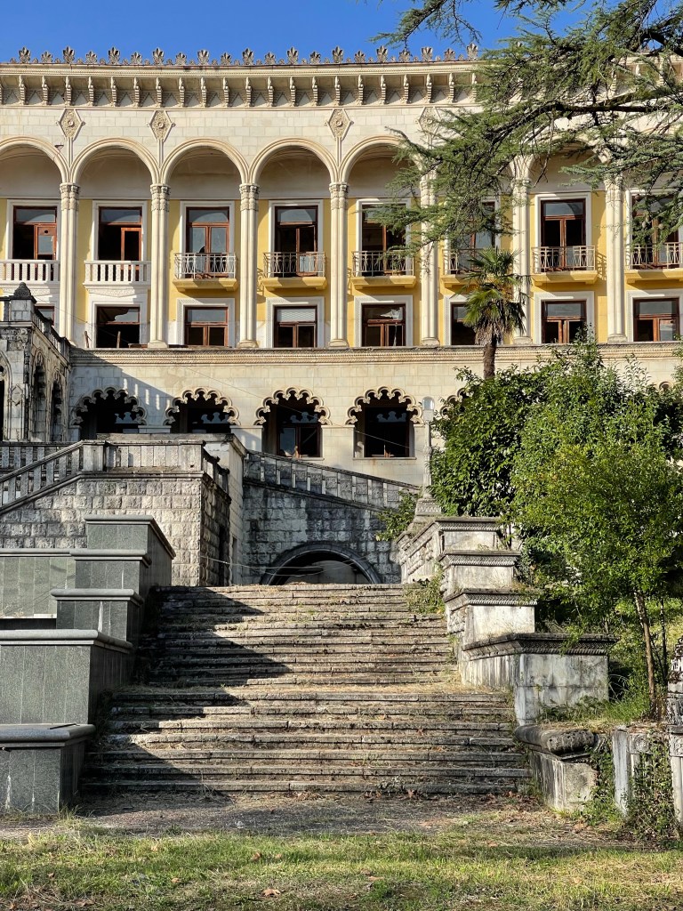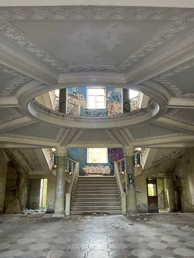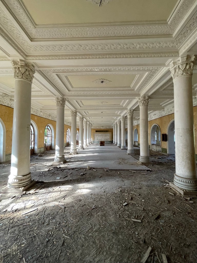 Badhuis nr 5 en 8 zijn de meest bezochte maar op weg naar Iveria, de 3de op onze lijst, lopen we langs een poort die niet op slot is. We lopen het plein op en al gauw wenkt een man ons zijn richting uit. Hij vraagt ‘inkom’ en hoewel we beter weten geven we hem toch het gevraagde geld. Deze afzetterij vergeten we al gauw wanneer we door het immense gebouw wandelen. Een statig trappenhuis, een theaterzaal, gigantische ruimtes met hoge plafonds en ramen. Knappe staaltjes houtsnijwerk, marmer, moulures…een decor om bij weg te dromen. Ik haal mijn interieurhartje op, Steven begint aan zijn volgende businessplan. 🤣 Zot en vreselijk jammer dat zoveel schoons zomaar staat te verrotten.