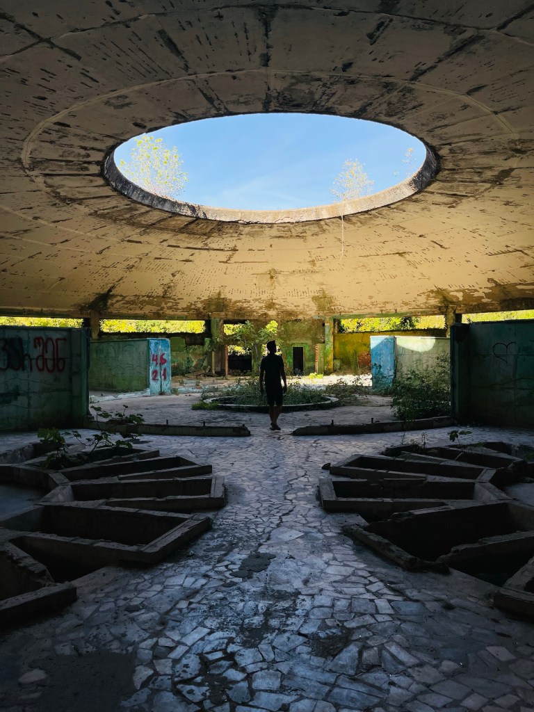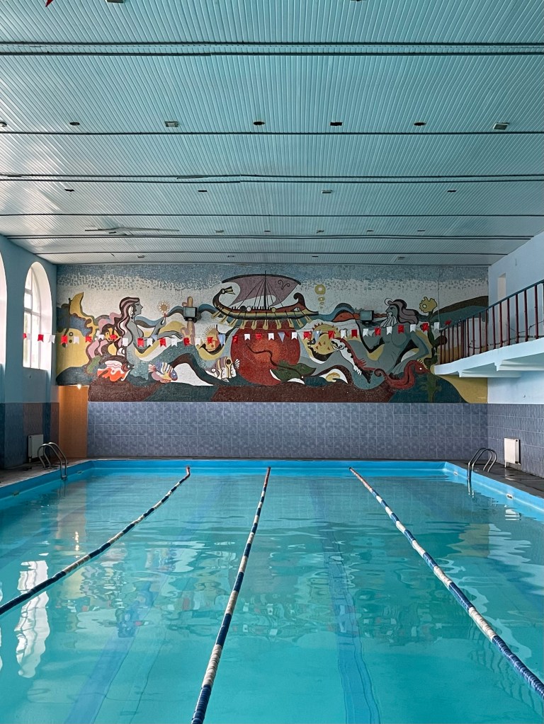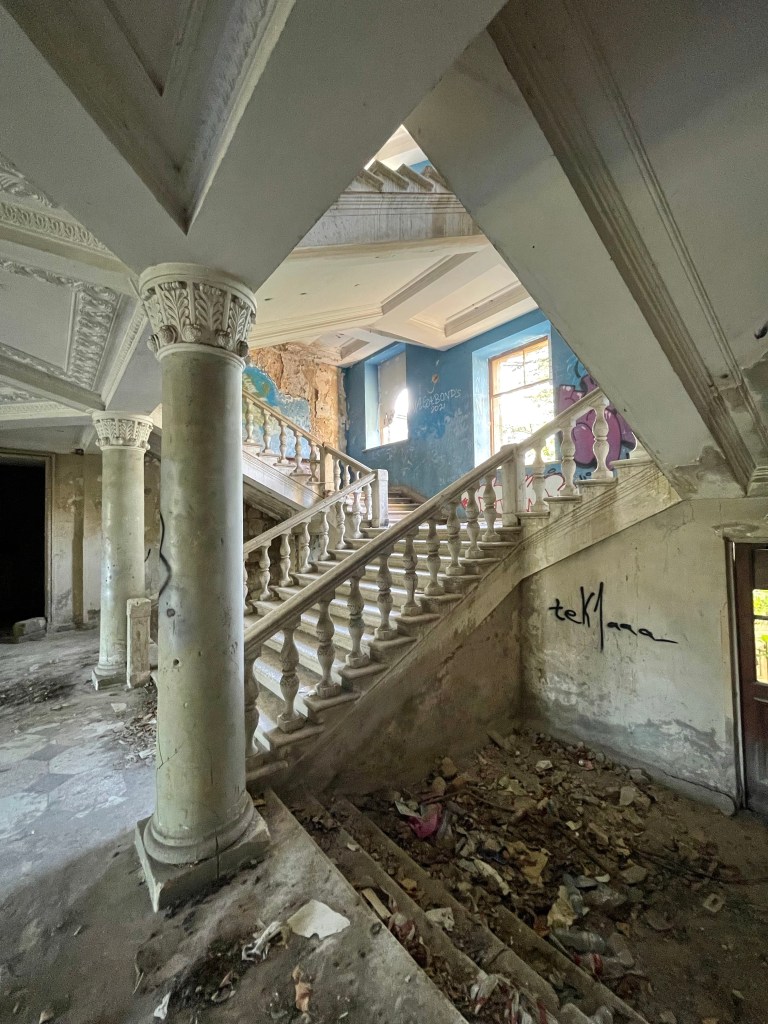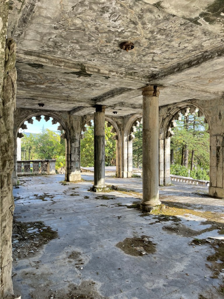 Badhuis nr 5 en 8 zijn de meest bezochte maar op weg naar Iveria, de 3de op onze lijst, lopen we langs een poort die niet op slot is. We lopen het plein op en al gauw wenkt een man ons zijn richting uit. Hij vraagt ‘inkom’ en hoewel we beter weten geven we hem toch het gevraagde geld. Deze afzetterij vergeten we al gauw wanneer we door het immense gebouw wandelen. Een statig trappenhuis, een theaterzaal, gigantische ruimtes met hoge plafonds en ramen. Knappe staaltjes houtsnijwerk, marmer, moulures…een decor om bij weg te dromen. Ik haal mijn interieurhartje op, Steven begint aan zijn volgende businessplan. 🤣 Zot en vreselijk jammer dat zoveel schoons zomaar staat te verrotten.