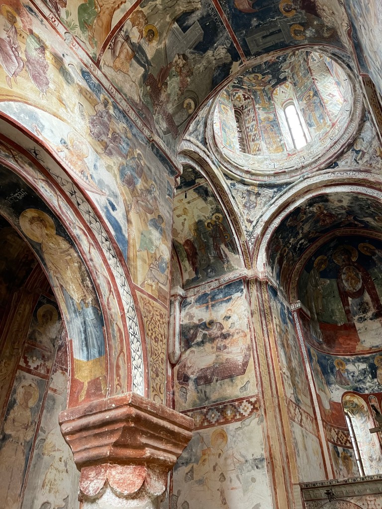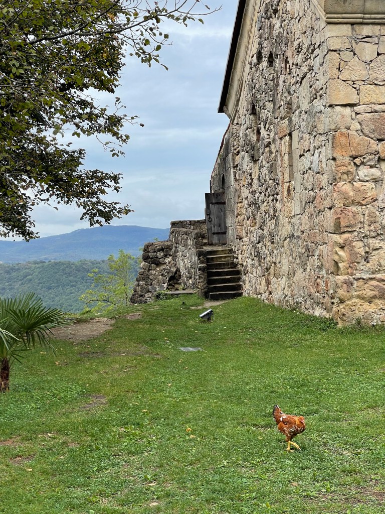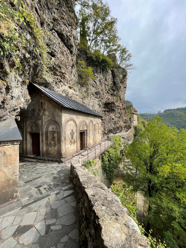 De volgende dag starten we met het Mgvimevi klooster dat gedeeltelijk in de rots uitgehouwen werd. We vragen ons telkens af hoe ze er in die tijd (13de eeuw) in slaagden om die gebouwen op te trekken op die hoogte. Fascinerend.