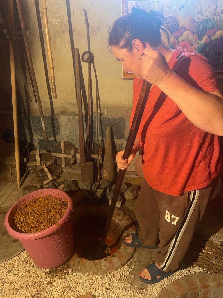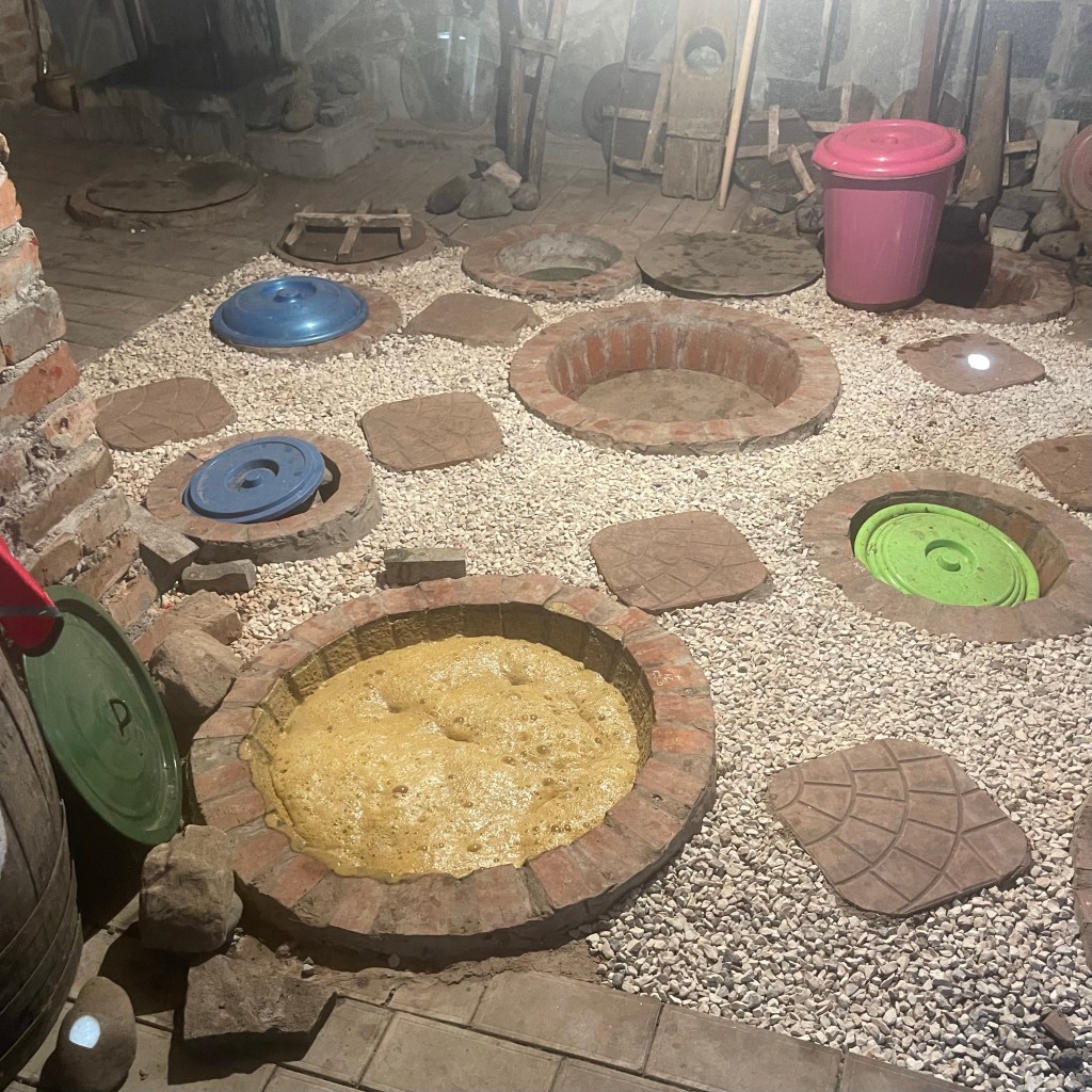 Ze maken hier nog wijn in qevri, aardewerken amforen die tot hun nek in de grond zitten (zo verborgen ze in oorlogstijd hun wijn). De wijn blijft 3 maand tot maximum een jaar in de qevri. Gedurende deze tijd wordt de wijn 3 maal daags geroerd.