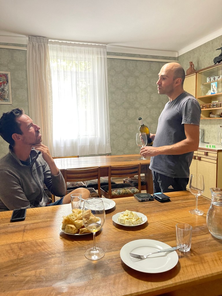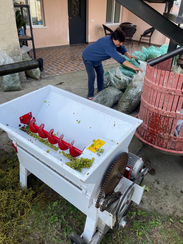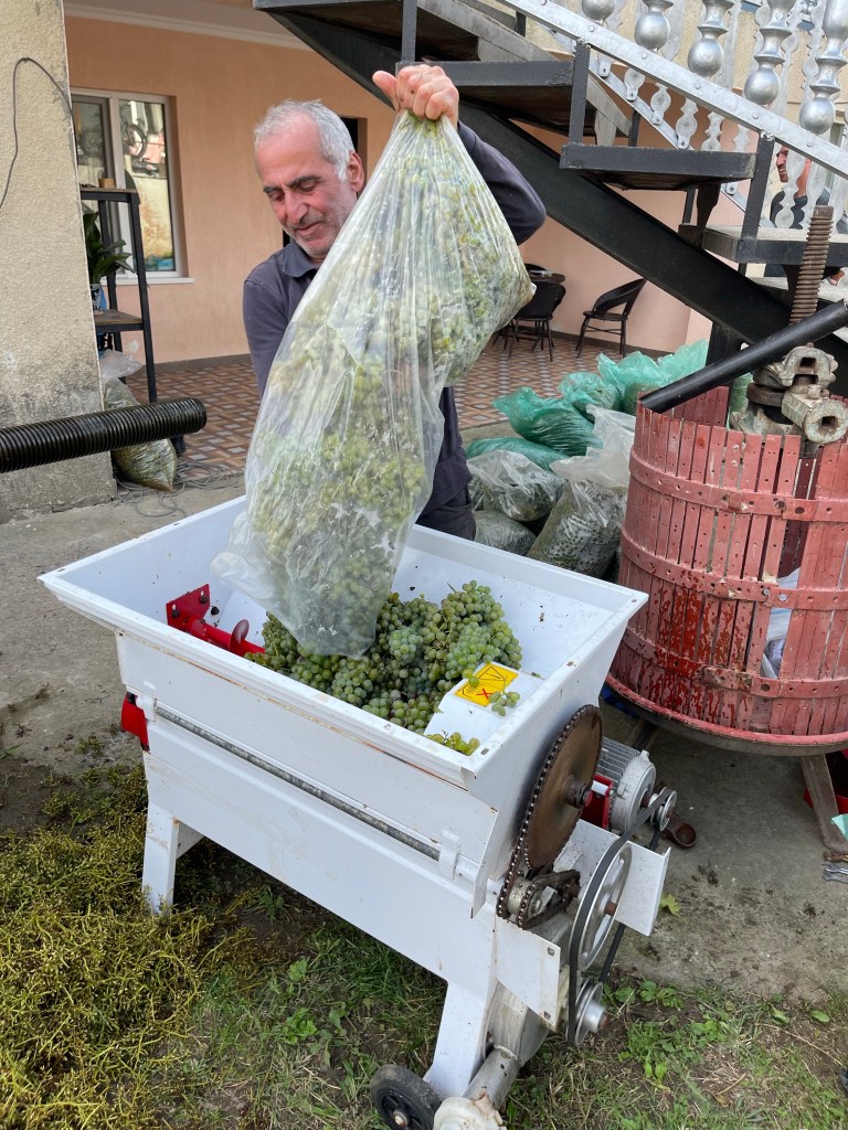 Op naar Tsjiatoera. We zijn nog geen 5km ver als we een bord tegenkomen met ‘Wine Route’. Dat moeten we geen twee keer passeren. 🤓 We bezoeken 2 wijnmakers. Ze zitten volop in hun oogst maar maken toch graag tijd voor ons.