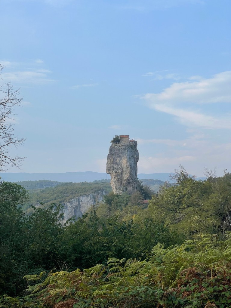 Onderweg naar Tsjiatoera stoppen we bij de Katskhi-Pilaar. Een kerkje op een kalksteen pilaar van 40 meter hoog.