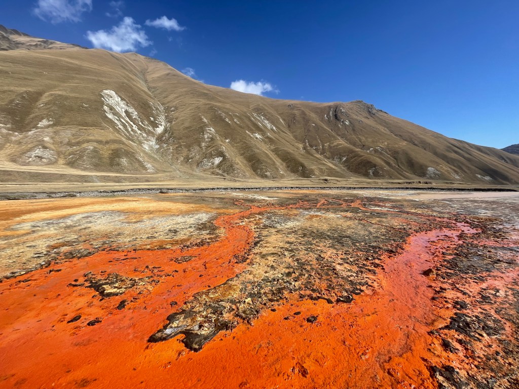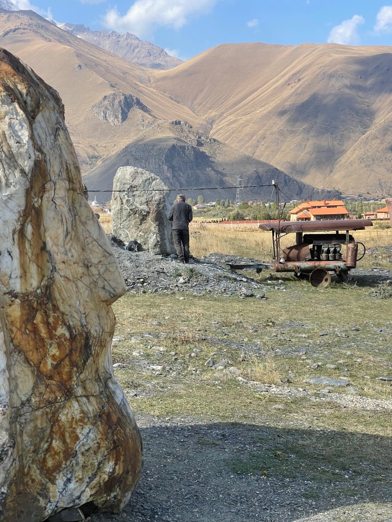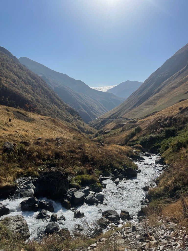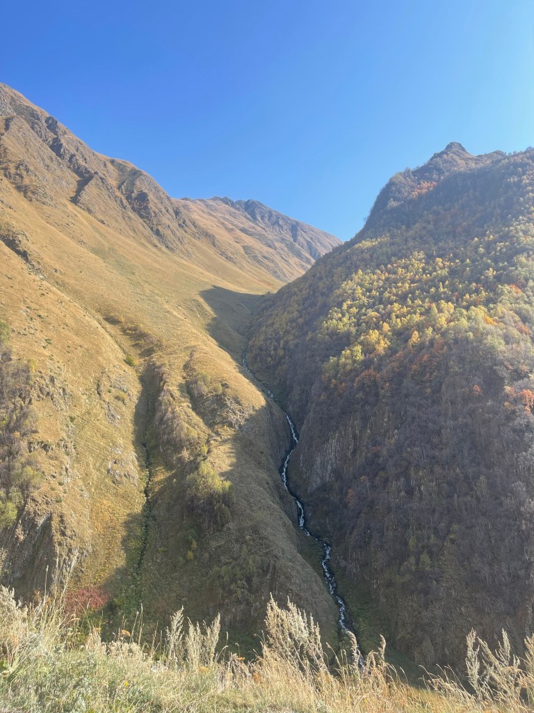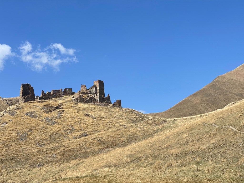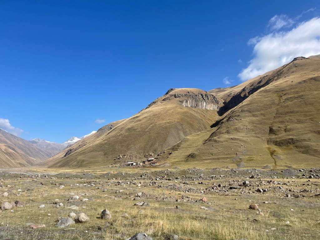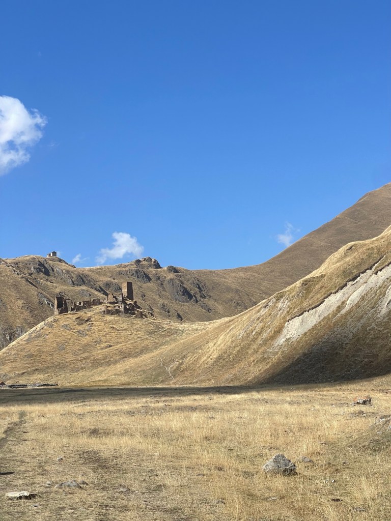 De eerste dag doen we de hike door de Truso Vallei. Weidse goudkleurige landschappen, verlaten dorpjes, travertijn formaties en minerale bronnen leiden naar het Zakagori fort. Verder loopt deze wandeling niet, het fort ligt aan de grens met Zuid-Ossetië en wordt bewaakt door militairen.