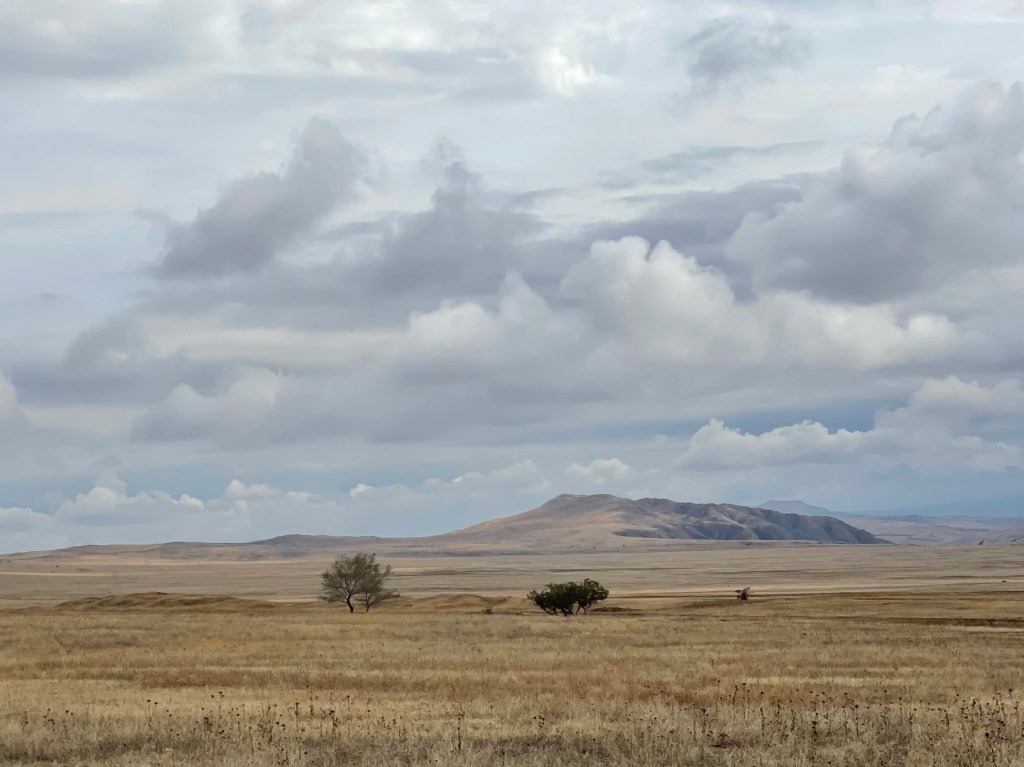 Al na enkele kilometers verandert het landschap naar Steppe. Uitgestrekte vlaktes met goudkleurige heuvels. Het deel klooster dat je nog kan bezoeken is niet zo indrukwekkend naar onze mening, het landschap errond des te meer. Regenboogkleurige bergen sieren de omgeving. Het doet ons terugdenken aan de Artist Drive in Death Valley.