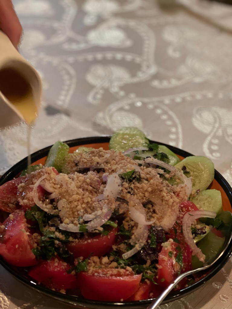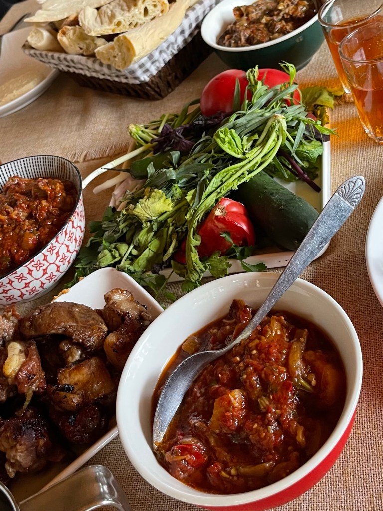 Een tocht voor niets dus. Die avond eten we in Giglo’s, een lokaal restaurantje met de liefste gastvrouw. De kip Shkmeruli is om duimen en vingers bij af te likken.