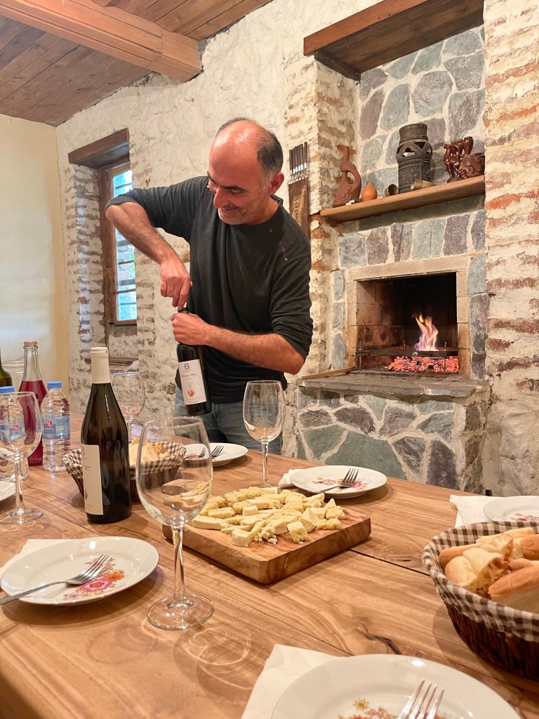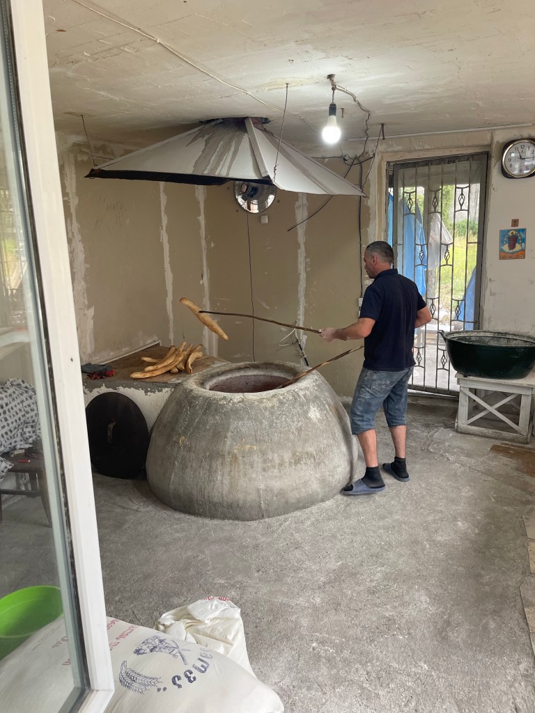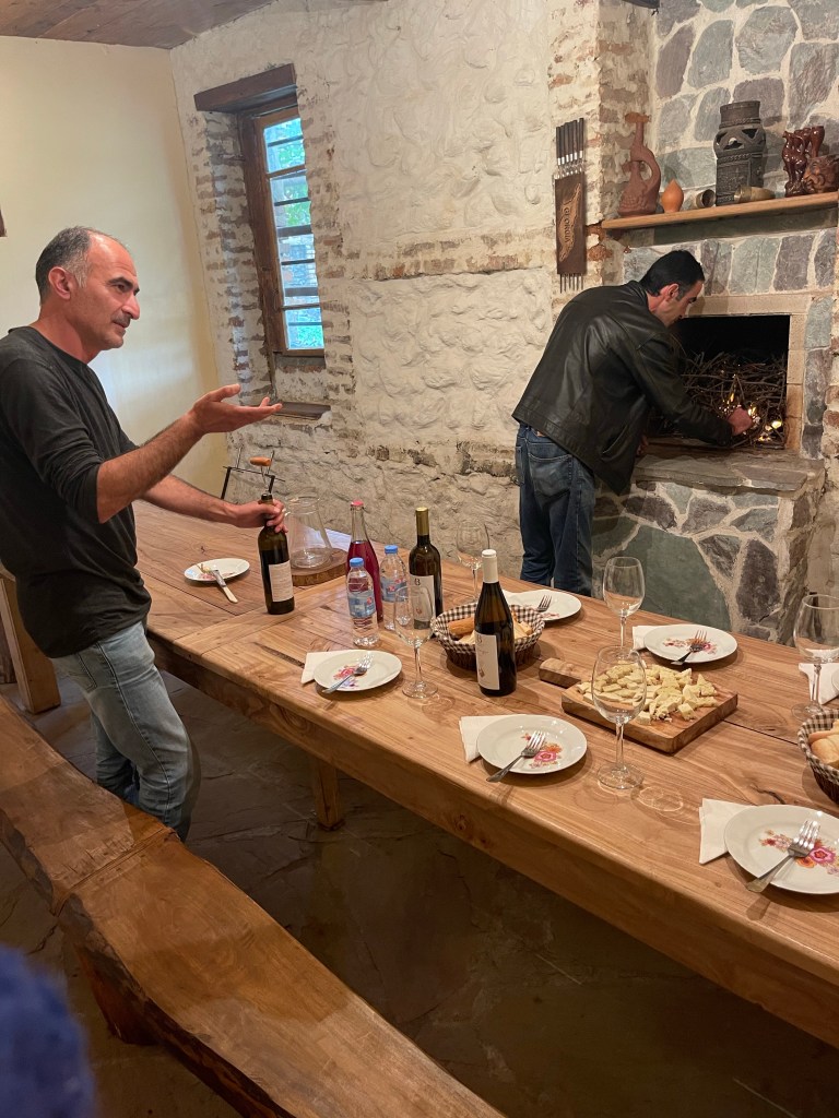Terug naar Kardenachi dus. Zurab ontvangt ons met open armen, we luisteren geboeid naar zijn verhaal. We hebben geluk want normaal doet zijn nonkel de proeverijen maar het is zijn vrije dag. Wat een eer. En die wordt nog groter als we bij het gezin mogen aanschuiven voor de lunch, een heerlijk maal bereidt door zijn vrouw.