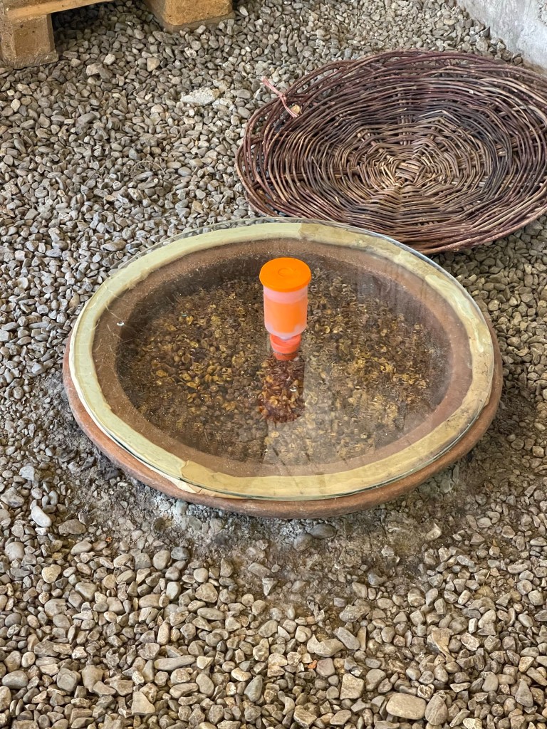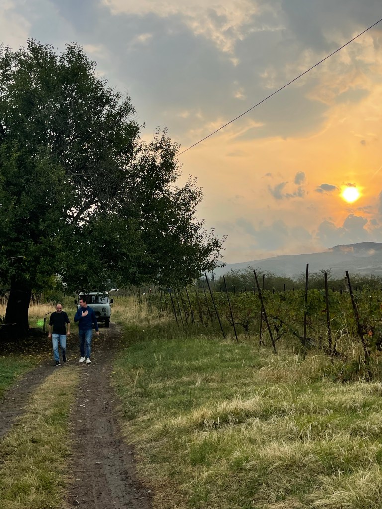 Verzadigd van het lekkere eten, wijn, de warme ontvangst en boeiende gesprekken zetten we onze tocht verder. Richting Bakurtsikhe waar Ilias van Batsashvili’s Marani ons opwacht aan de supermarkt om ons voor te rijden naar zijn ‘kelder’. We ontmoetten hem al in Tbilisi en zouden ook van zijn wijnen wel wat meer willen weten en proeven. Na een kleine tocht door veldbaantjes wanen we ons in een zuiders paradijsje.