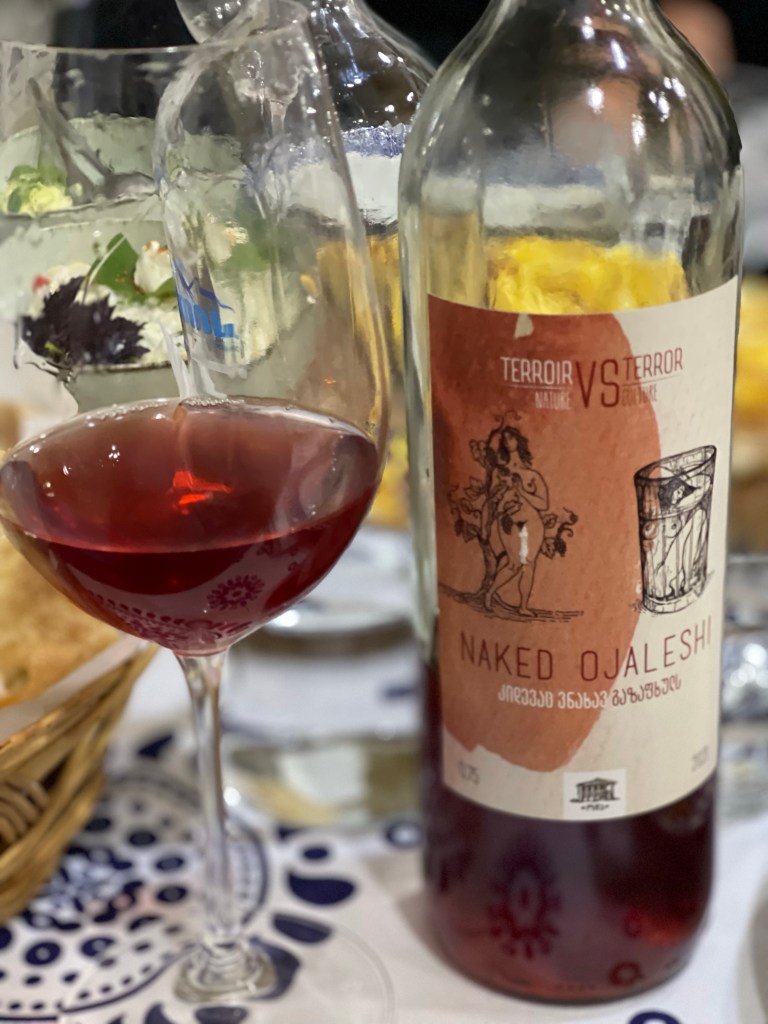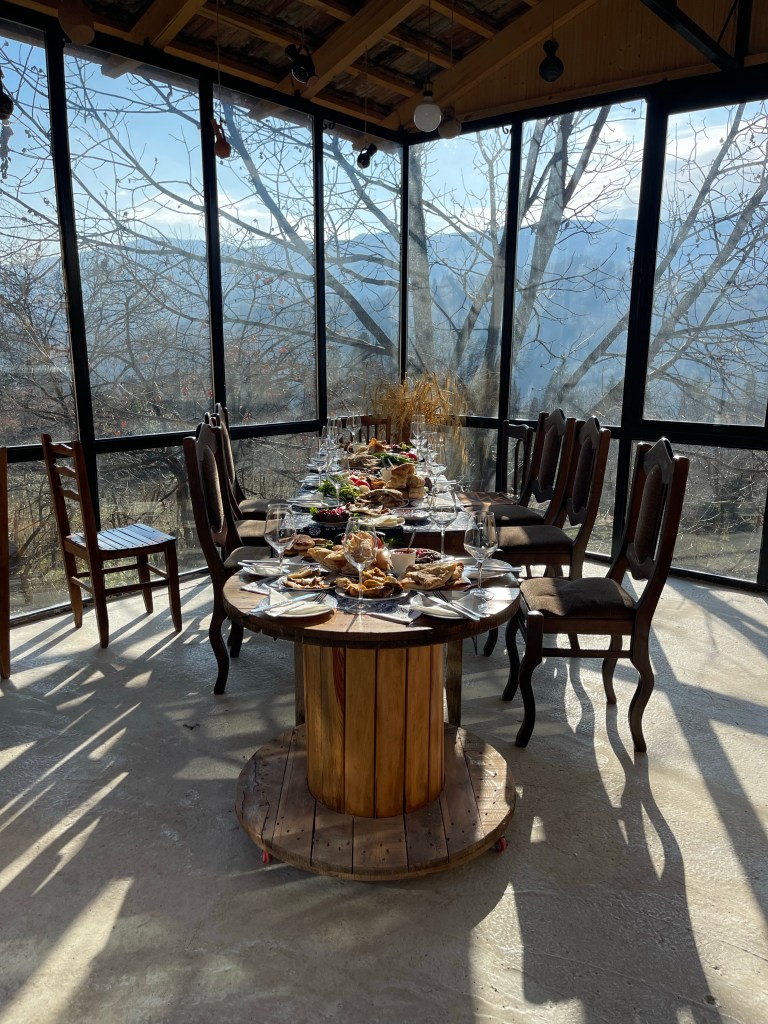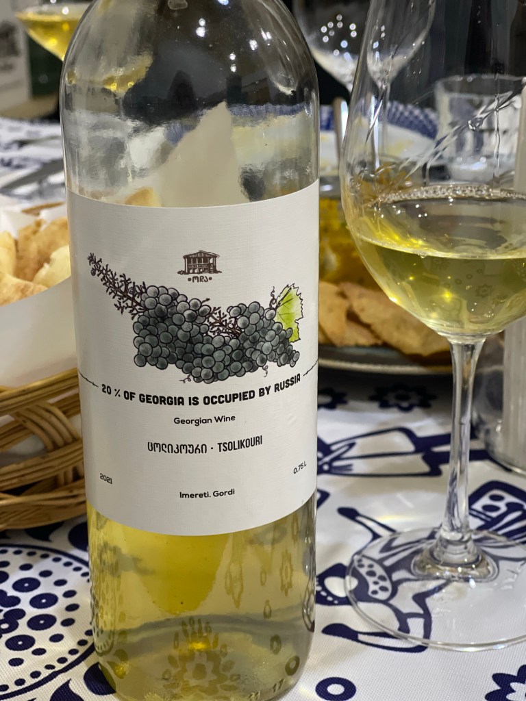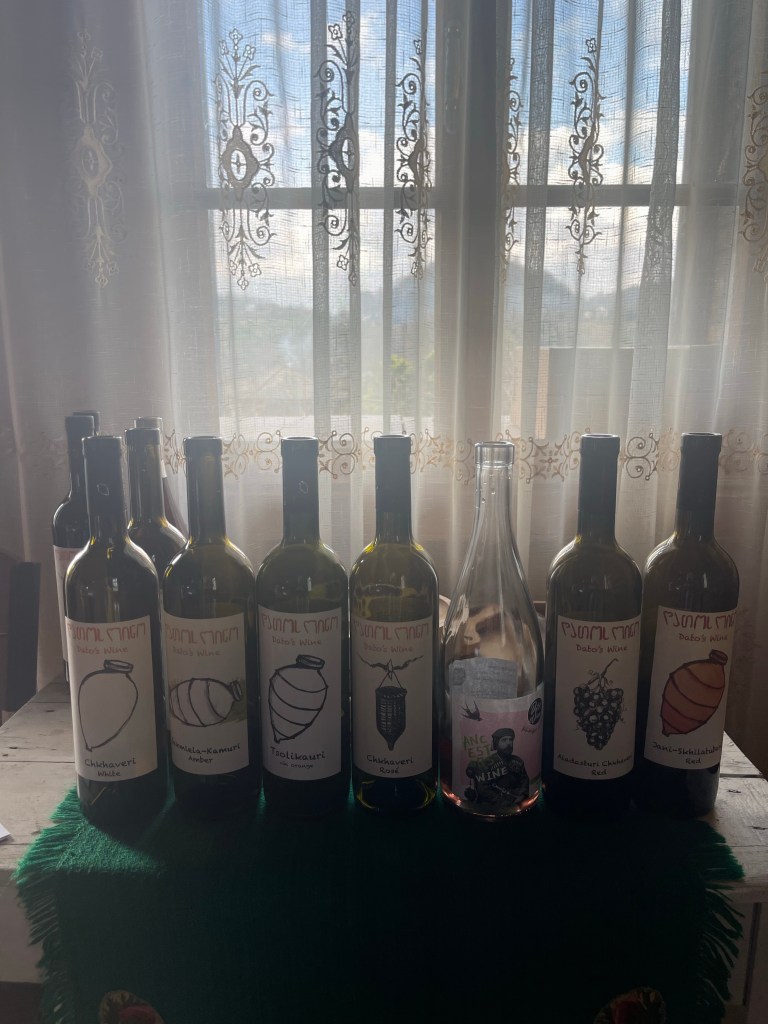 Op naar de tweede. We blijven in het westen maar iets noordelijker. Een prachtige gedekte tafel lacht ons tegemoet. Er staan 30 wijnen op het programma…stevig! Alleen al voor de etiketten zou je de wijn kopen. Een hart voor Ukraine, een duidelijke F*** You naar de Russische bezetting en een pleidooi voor de vrijheid van de vrouw. De laatste 2 zijn van de hand van Zaza’s vrouw, Keto. Een van de geweldige vrouwelijke wijnmakers die Georgië ondertussen kent. Dat is hier een familie naar mijn hart!