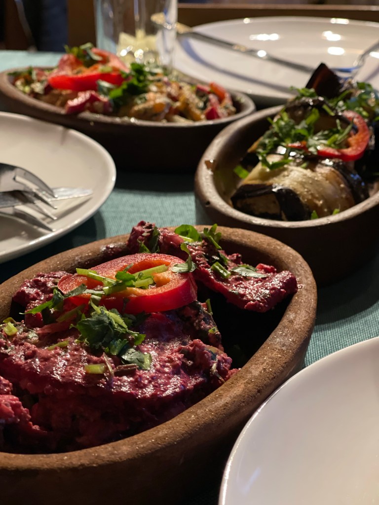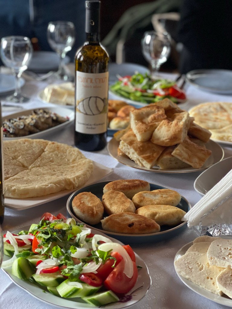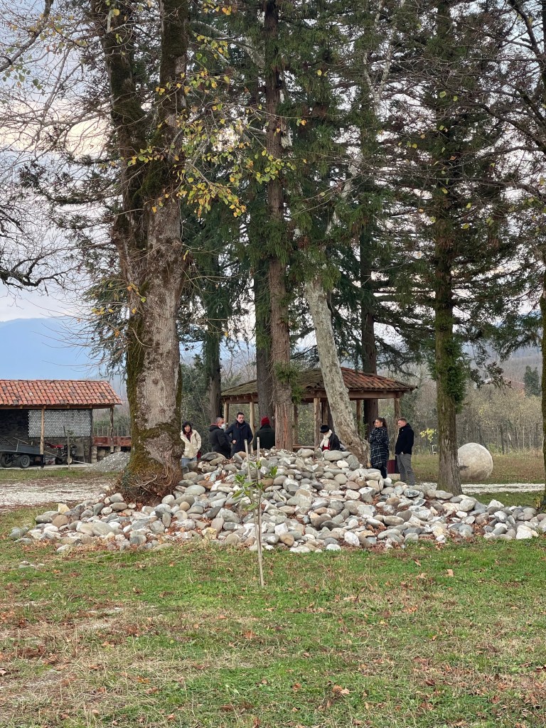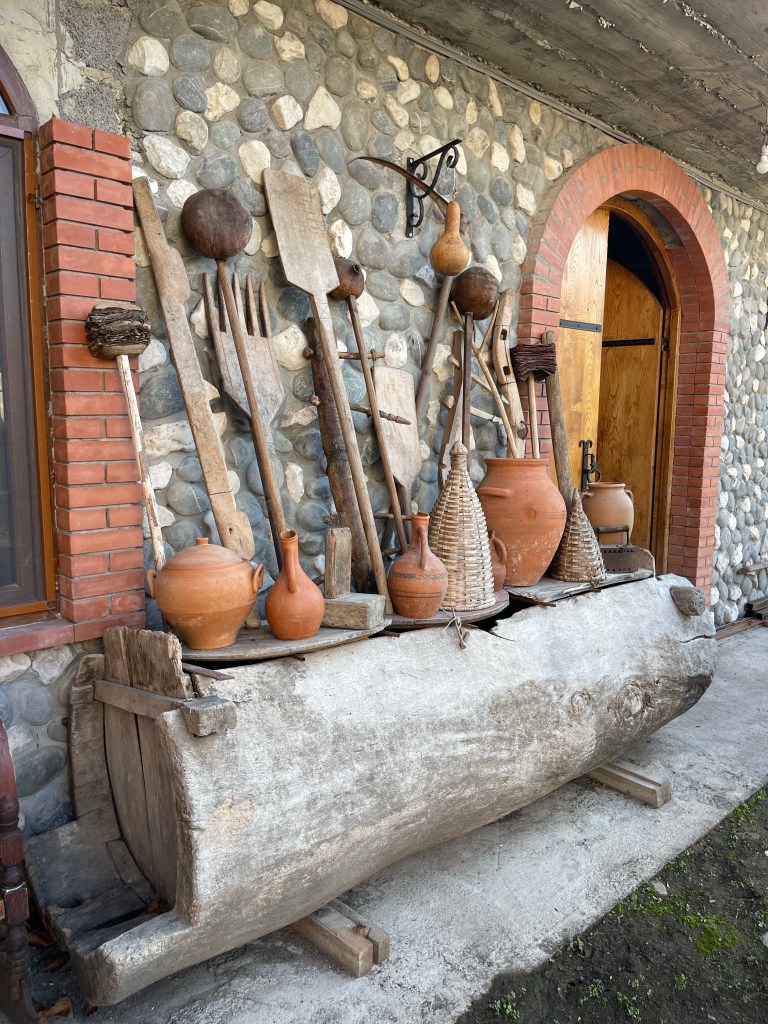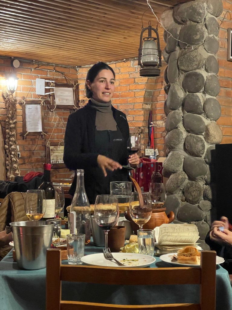 Op naar de tweede. We blijven in het westen maar iets noordelijker. Een prachtige gedekte tafel lacht ons tegemoet. Er staan 30 wijnen op het programma…stevig! Alleen al voor de etiketten zou je de wijn kopen. Een hart voor Ukraine, een duidelijke F*** You naar de Russische bezetting en een pleidooi voor de vrijheid van de vrouw. De laatste 2 zijn van de hand van Zaza’s vrouw, Keto. Een van de geweldige vrouwelijke wijnmakers die Georgië ondertussen kent. Dat is hier een familie naar mijn hart!