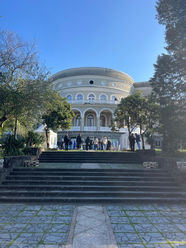 Zaterdag is het tijd voor de beurs. Deze vindt plaats in een van de nog gebruikte spa resorts in het nabij gelegen Tskaltubo. Een prachtige zaal vol, jawel…wijn. Een orkest zet de beurs op gang, een aangenaam sfeertje zo’n wijnbeurs.