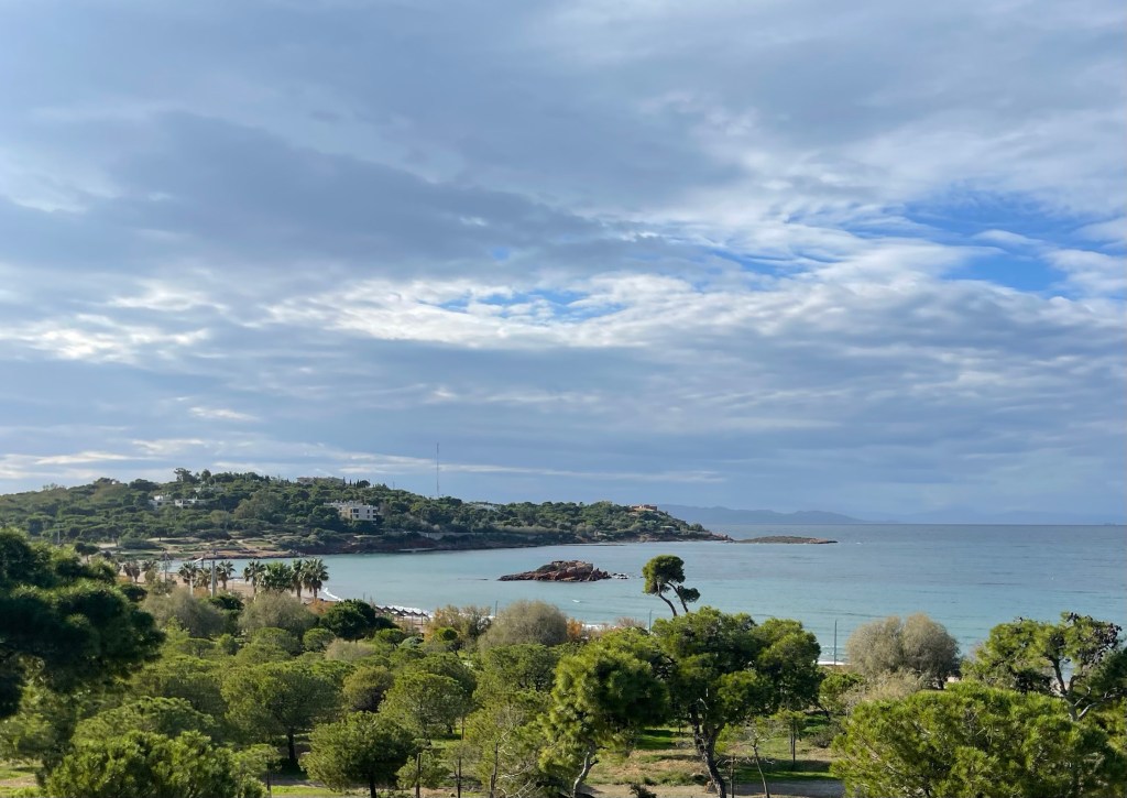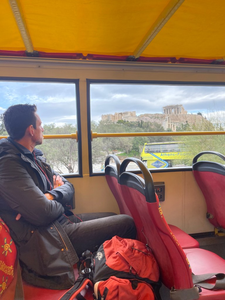 We komen al aan om 7u ‘s ochtends maar kunnen pas om 14u op de kamer. Eerst een ontbijt en kijken hoe we de stad best ontdekken. Hoewel we anders gewoon al stappend door de straten zouden dwalen zitten we nu nog even vast aan onze zware rugzakken. Met de weinige slaap (in mijn geval letterlijk geen oog dicht gedaan) voelen deze als beton op onze rug. We besluiten een HopOnHopOff bus te nemen, voor alles een eerste keer. 😅 Athene is uitgestrekt! We nestelen ons bovenaan de bus en nemen als eerste de verste rit, Beach & Rivièra. Een tocht langs de hele kustlijn die 2u duurt.