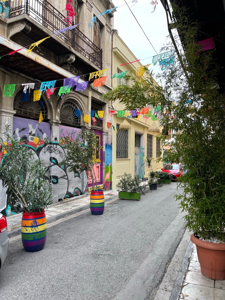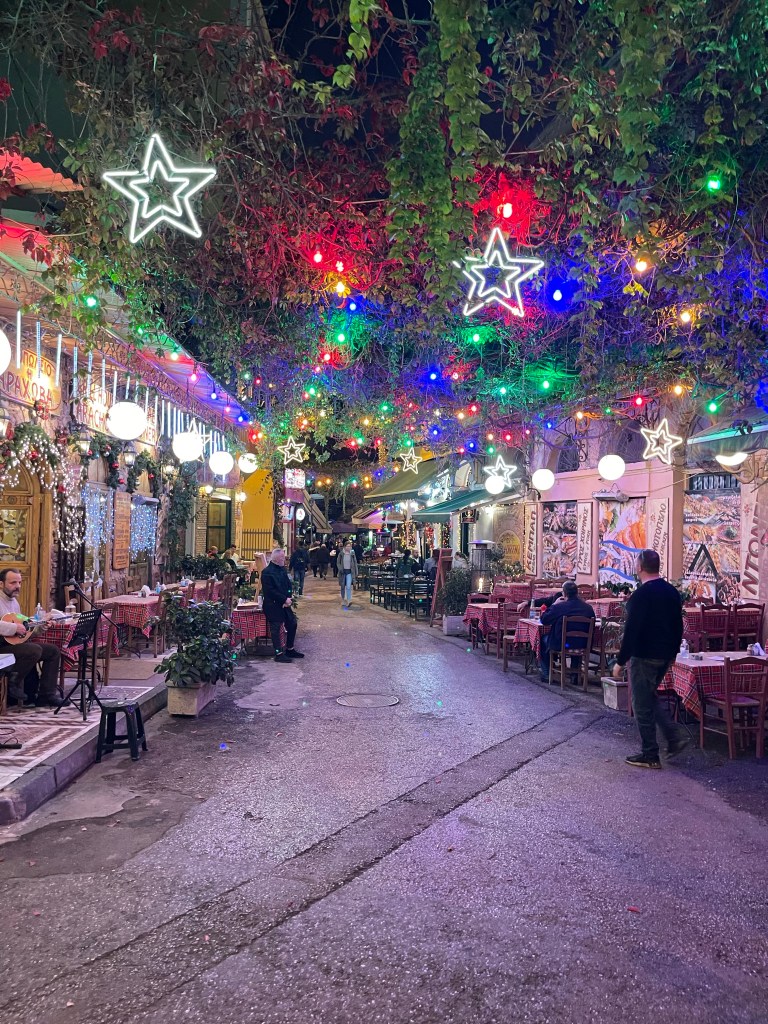 Een kleine lunch en we kunnen inchecken. Na een powernapke terug de stad in. De wijk Psiri bruist, toffe winkeltjes, leuk uitziende bars en restaurants en een overdaad aan Kerstlichtjes.