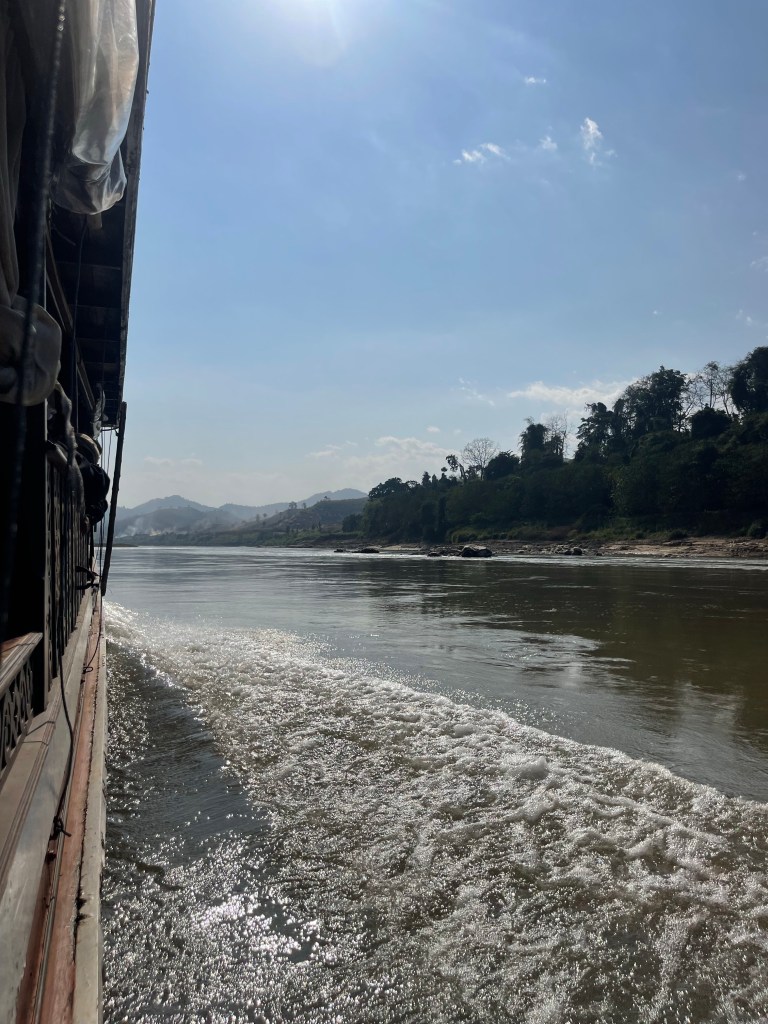 De volgende ochtend op tijd naar de pier om zeker te zijn van goede plaatsen op de boot (niet aan de motor). Op tijd is om 10u ter plaatse, de boot vertrekt om 11u30. We laden onze rugzakken in en zetten ons op een bankje in de zon met een koffie. Stilaan stroomt het volk toe. Om 11u nemen we onze plaatsen in. En dan lijkt het alsof ze plots 3 grote tourbussen droppen. De boot zit overvol, er worden banken bij gehaald van andere boten, bagage wordt gestapeld in het midden. Uiteindelijk vertrekken we om 12u. 90% van de inzittenden zijn vroege twintigers. Ze vliegen meteen in de pinten en al snel loopt en zit iedereen door mekaar. Chaos en luid. De landschappen bieden rust en wij worden een dagje ouder blijkbaar. 😅 We varen langs afgelegen dorpjes, haventjes, jungle. We zijn opnieuw goed voorbereid, geen trui of jas bij de hand en de wind maakt het behoorlijk fris. Ik hoor ons moeke al zeggen; moet je daarvoor zo oud geworden zijn!?