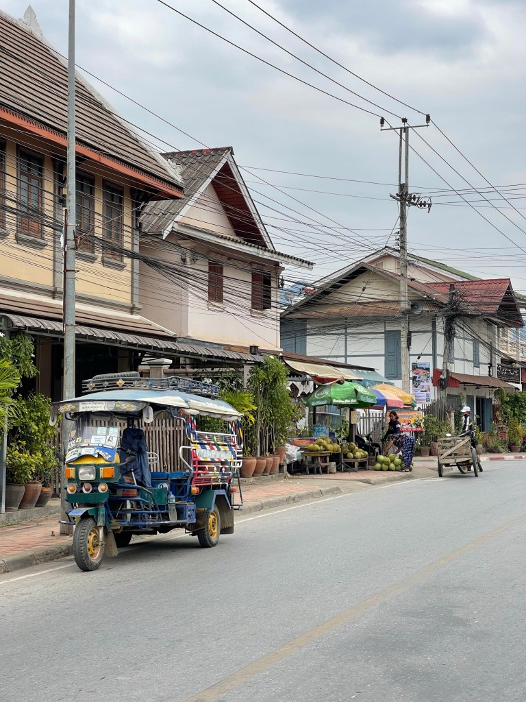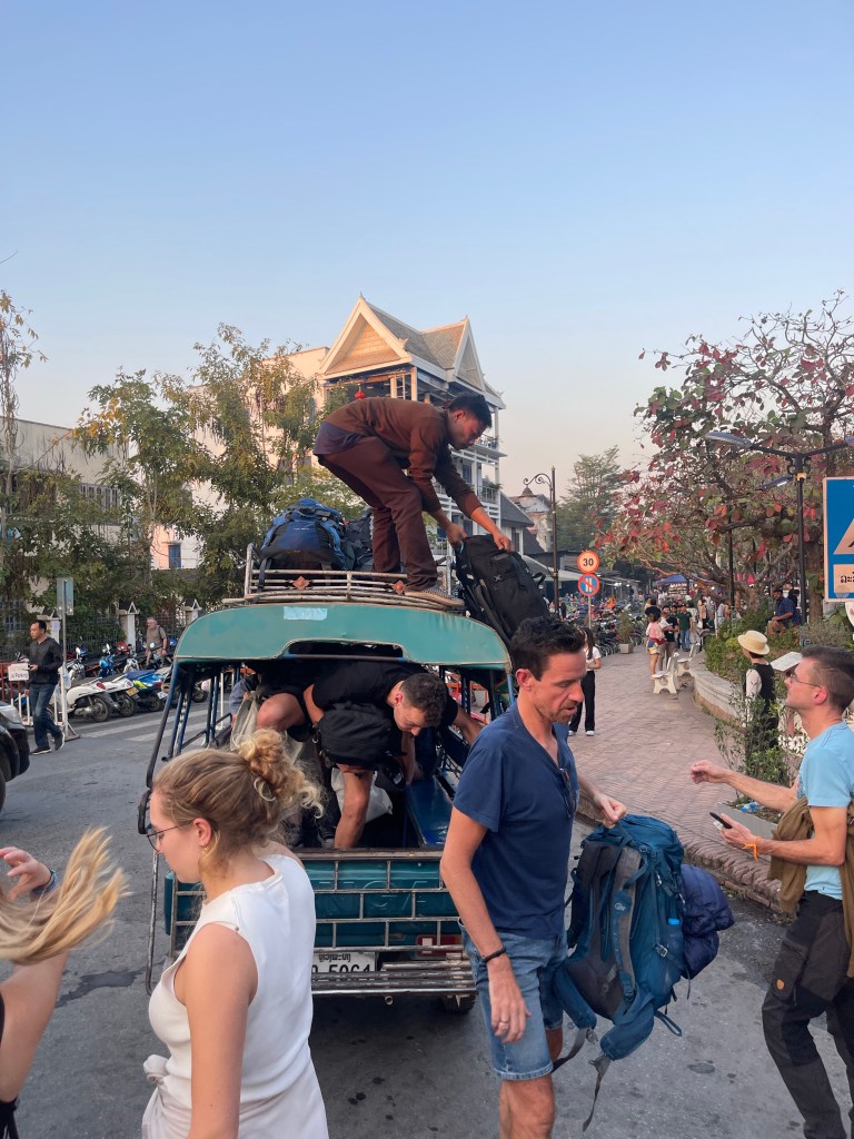 Er zijn 4 aanlegsteigers in Luang Prabang, we worden gedropt aan de verste. Daar is een goed verdienmodel op neergezet. Er staan tuktuks klaar en er is een ticketoffice waar je voor 50000 kip pp (€2,75) een ticket kan kopen. Met 10 worden we in een wagen gepropt, de bagage los erboven op. Een Fransman maakt een scène en scandeert dat hij geen varken is. Alsof het die mannen wat kan schelen. Iedereen moet uiteindelijk toch naar de stad. Bij de collecte van de tickets blijkt er in onze wagen 1 iemand niet betaald te hebben. Dat is hier zoals in de colruyt, daar kies ik ook altijd de verkeerde rij. 🙄 Na wat discussie en uiteindelijk 50000 kip extra vertrekken we dan eindelijk.