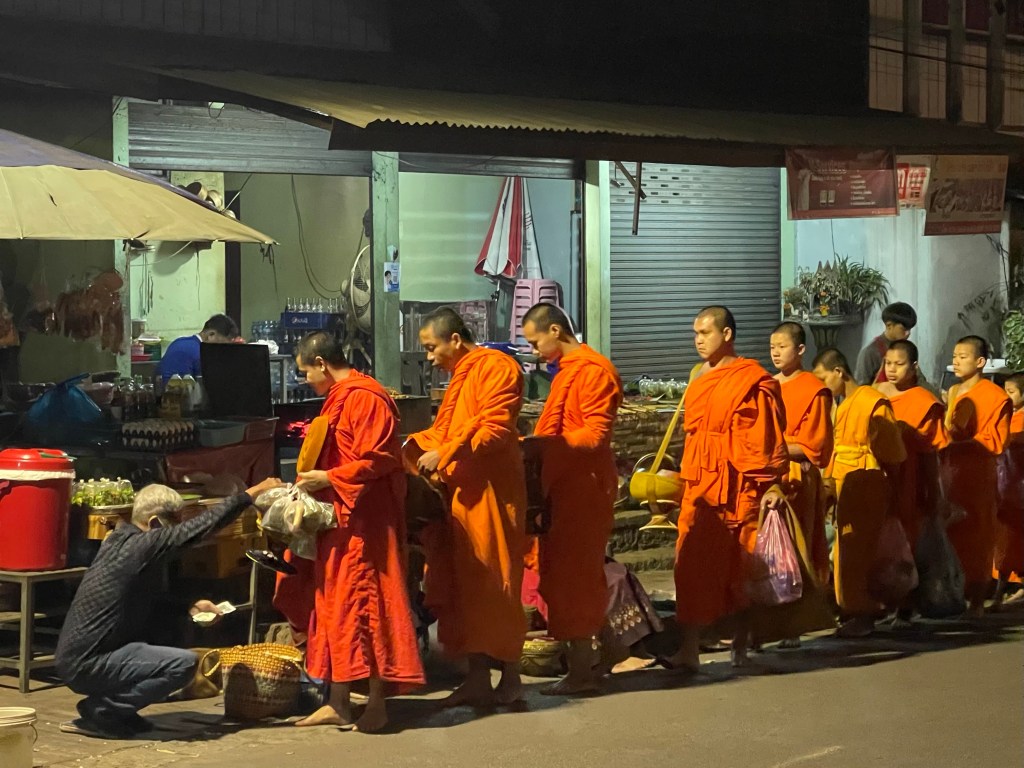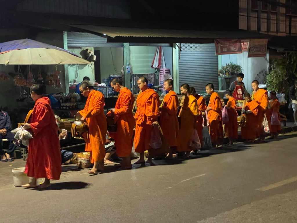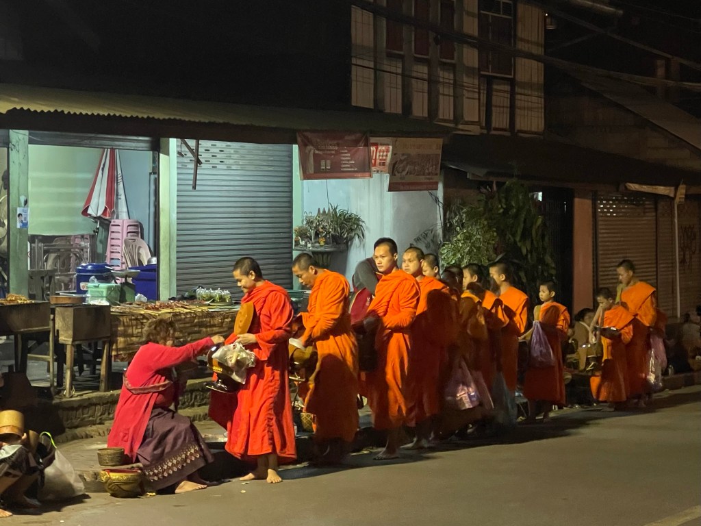 De volgende ochtend zeer vroeg uit de veren. Rond 5u30 start de ‘Alms-giving Ceremony’. De monniken halen in de straten aalmoezen op in ruil voor zegens en gelukwensen. We waren gewaarschuwd maar het zien wekt echt afschuw op. Niet de ceremonie op zich, die is prachtig om te aanschouwen, maar het gedrag van de toeristen. Waar wij op een respectvolle manier en met de nodige afstand toekijken zijn er tal van anderen die zonder enige schroom hun lens in het gezicht van de monniken duwen. Horror. Hoewel ik het dan zelf ook niet meer zou kunnen zien mogen ze toeristen van mijn part de toegang ontzeggen om de straat te betreden rond die tijd.