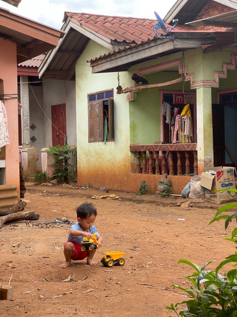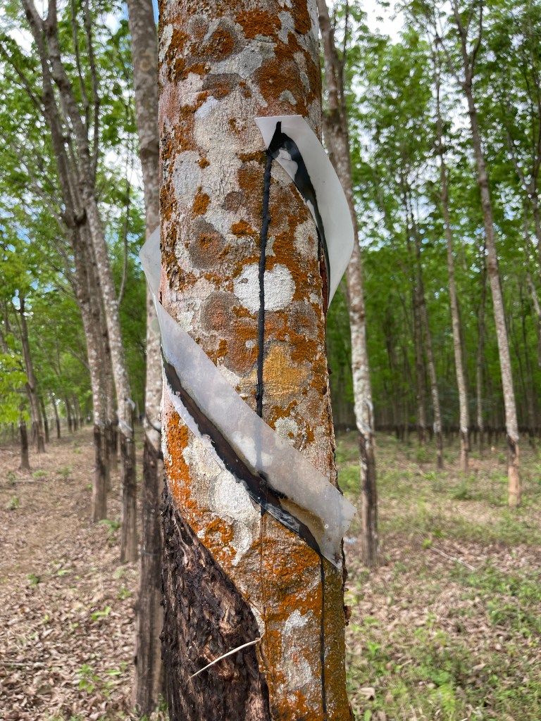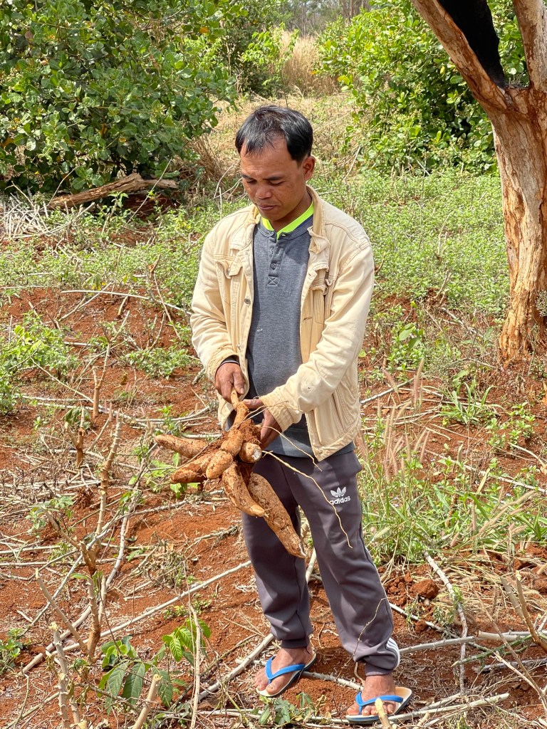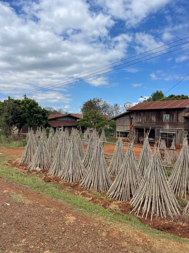 Overal, vanaf ongeveer centraal Laos komen we grote vlaktes tegen met gesneden Maniok. Pas bij Mr. Vieng komen we te weten wat hier nu precies achter zit. Voor de Laotianen is dit het nieuwe goud. Het is heel simpel te planten; je snijdt een tak in stukken en stopt deze letterlijk gewoon in de grond op een 60-70cm van mekaar. Een jaar later kan er geoogst worden.