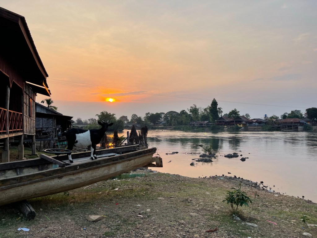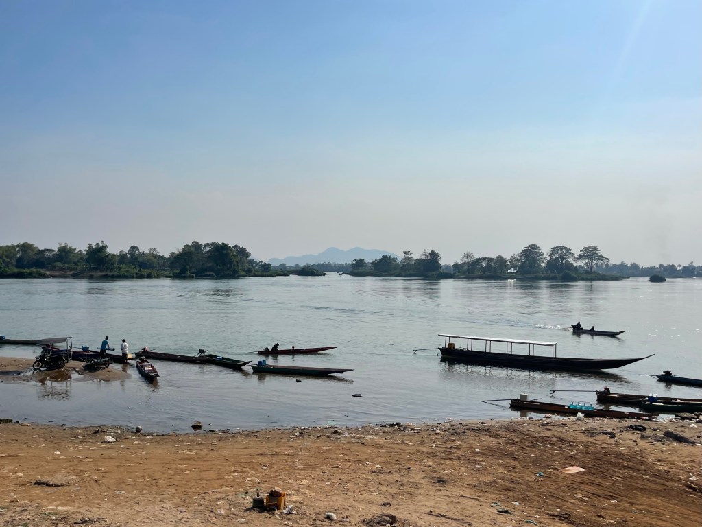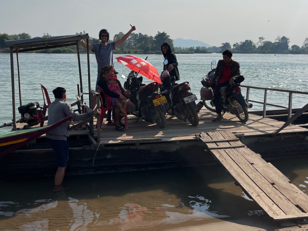 Op naar Don Khon. We komen aan aan de pier. Meteen komt er een dame aangelopen. 600000 kip (€34) om 1 scooter en 1 persoon over te zetten, enkele tocht. Dat lijkt ons toch wat teveel van het goeie. We zetten ons even aan kant en zoeken online naar meer info. Ondertussen arriveert de veerboot en ga ik aan de schipper zelf vragen hoeveel een ritje kost. 700000 kip voor 2. Nog steeds veel maar veel keuze hebben we niet. De scooters het vlot op. Dat laten we doen want we zien onszelf al eindigen in de Mekong. Die gasten hebben er hun plezier in. Midden in de tocht zetten ze de motor uit en er komt een andere boot aangevaren. De scooters worden op het water van vaartuig gewisseld en er wordt gevraagd om te betalen. 70000 kip per scooter + passagier. Die communicatie toch, niet altijd duidelijk. Maar soit, de overtocht kost ons in totaal €7,8. We doorkruisen Don Det om te eindigen op Don Khon waar we het hotel boekten. Een kamer met balkon en uitzicht op de Mekong, we hadden het slechter kunnen treffen.