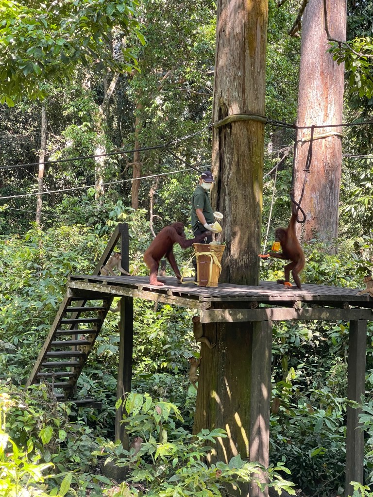 De volgende dag bezoeken we het Orang-oetans Rehabilitatie Center in Sepilok. Hier worden gewonde, zieke, overlevenden van stropers en de dieren die door de kap verdrongen zijn, opgevangen en voorbereid om terug de natuur in te gaan. Dit alles zogezegd in een ‘wilde’ omgeving. Met honderd anderen staan gapen naar beesten die gevoederd worden, dat geeft ons toch meer een zoo-gevoel.