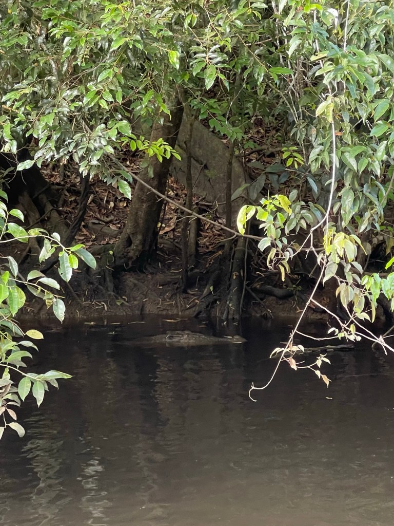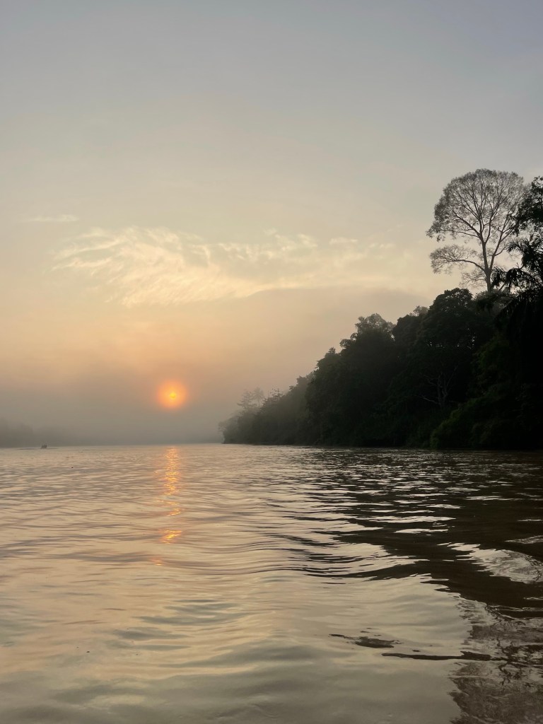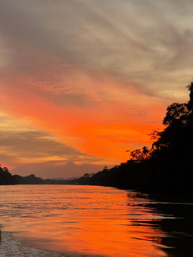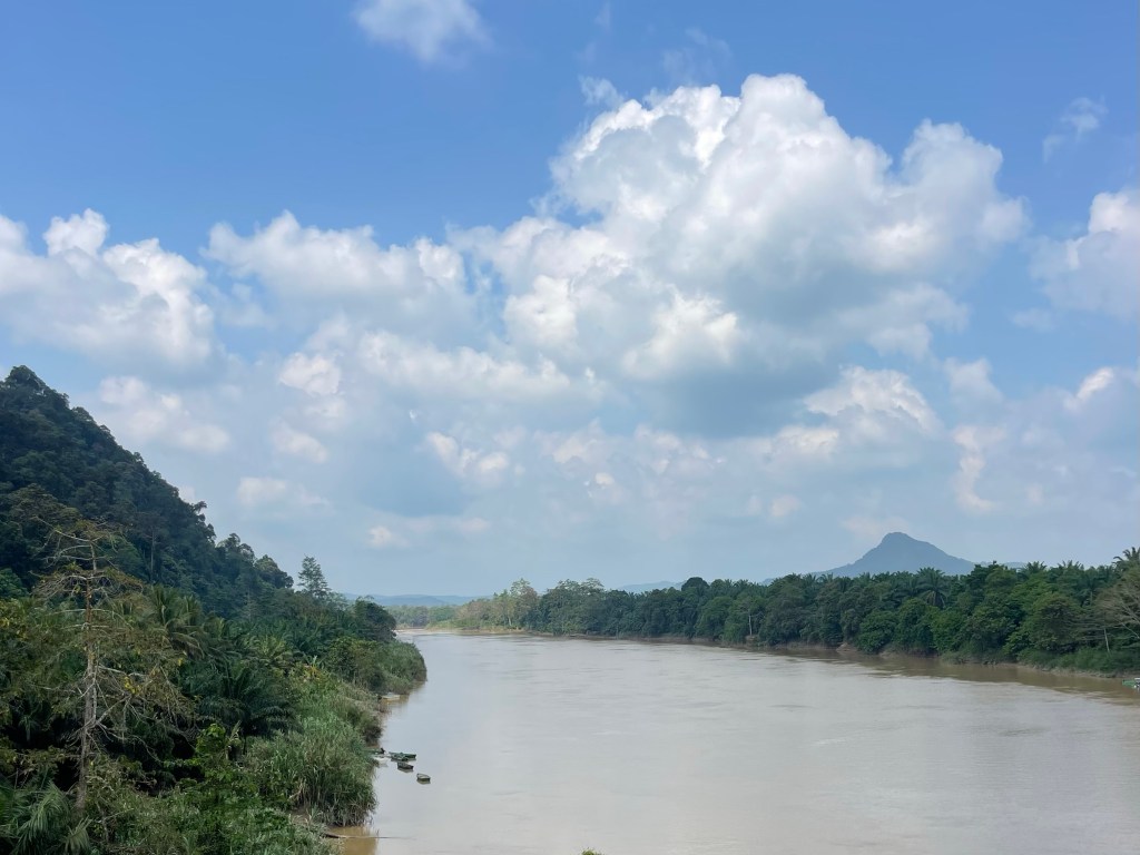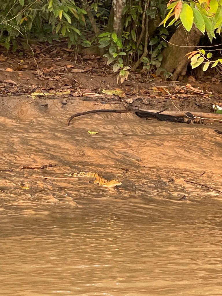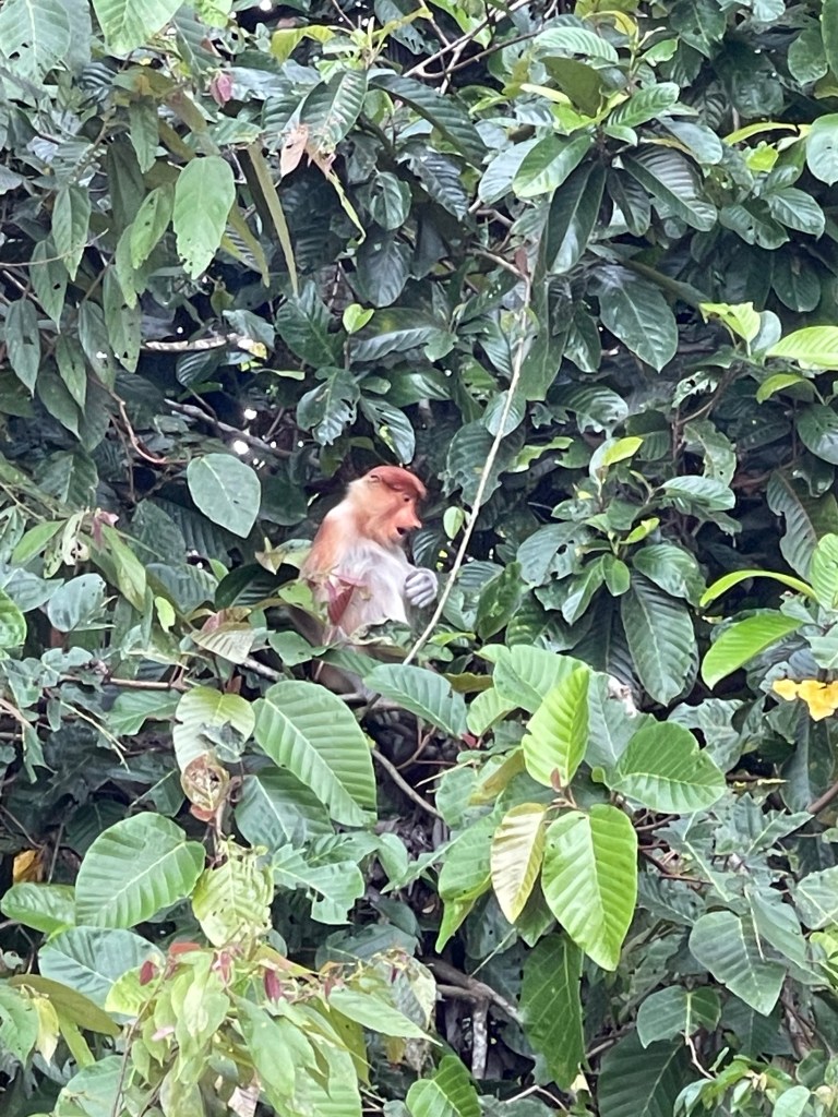 Op naar Kinabatangan. De langste rivier van Maleisië die omzoomd wordt door nog het weinige regenwoud dat rest. Vanuit onze lodge doen we twee boottochten om dieren te spotten. Tijdens de namiddagtocht zien we dan wel een orang-oetan in het wild en ook neusapen en makaken, volgens de gids de ‘jungle-maffia’. ‘s Ochtends zien we een babykrokodil en veel exotische vogels ttz, meestal zwarte vlekken in de top van een boom en we zijn niet echt vogelaars. 😉